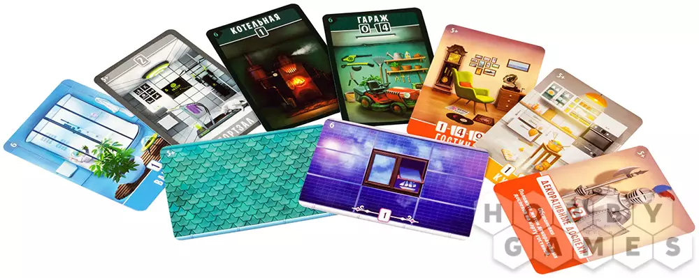 Получив карты, вам необходимо реализовать их. Карты комнат можно ставить только на вторых и третьих этажах, при этом под комнатой не должно быть свободных ячеек. Карты подвала и крыши размещаются в специальных ячейках. В крайнем случае, когда комнату ставить некуда, карту можно расположить лицевой стороной вниз, как пустую комнату. К сожалению, она очков вам не принесёт.