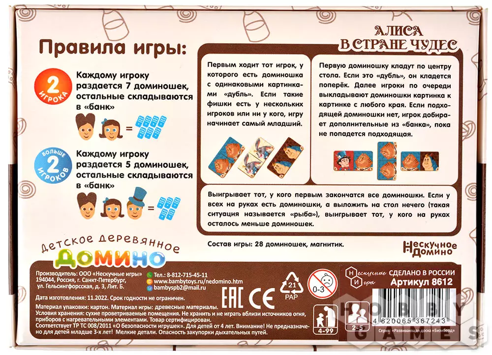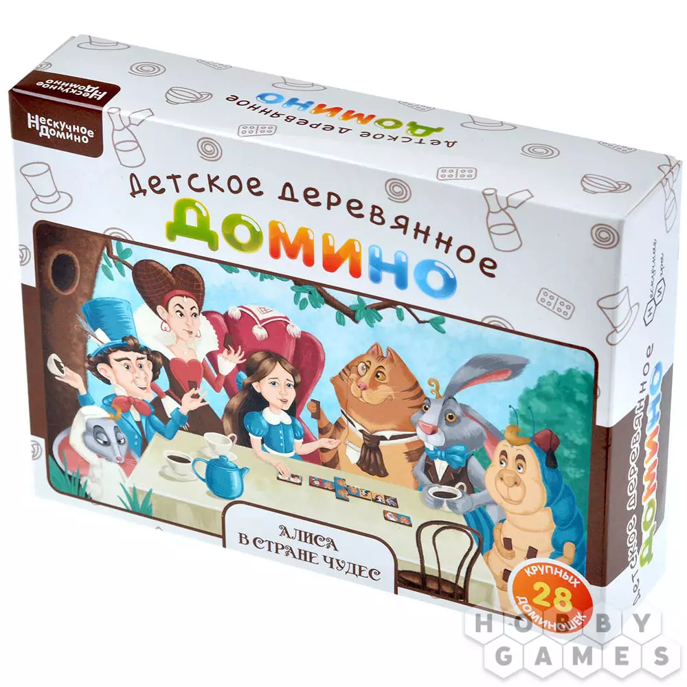Домино – игра, которую знают и любят люди разных интересов и поколений. Эта игра увлекательна, интересна и создает азарт, поэтому всей семье нравится проводить время за игровым столом. Деревянные доминошки приятные на ощупь и привлекательны для детей из-за иллюстраций любимых ими сказок. Мир безграничных фантазий, чаепитие у Безумного Шляпника и Белый кролик ждут молодых игроков! А лёгкие правила позволят малышам легко включиться в игру, или использоваться в качестве конструктора в свободное время.