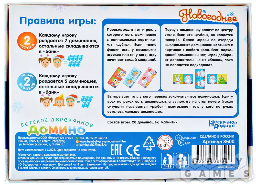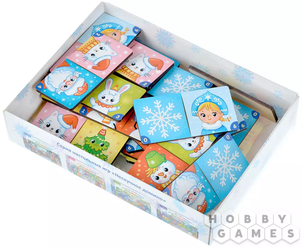 Домино – игра, которую знают и любят люди разных интересов и поколений. Эта игра увлекательна, интересна и создает азарт, поэтому всей семье нравится проводить время за игровым столом. Деревянные доминошки приятные на ощупь и привлекательны для детей из-за иллюстраций любимых ими сказок. Дед Мороз и Снегурочка ждут молодых игроков! А лёгкие правила позволят малышам легко включиться в игру, или использоваться в качестве конструктора в свободное время.