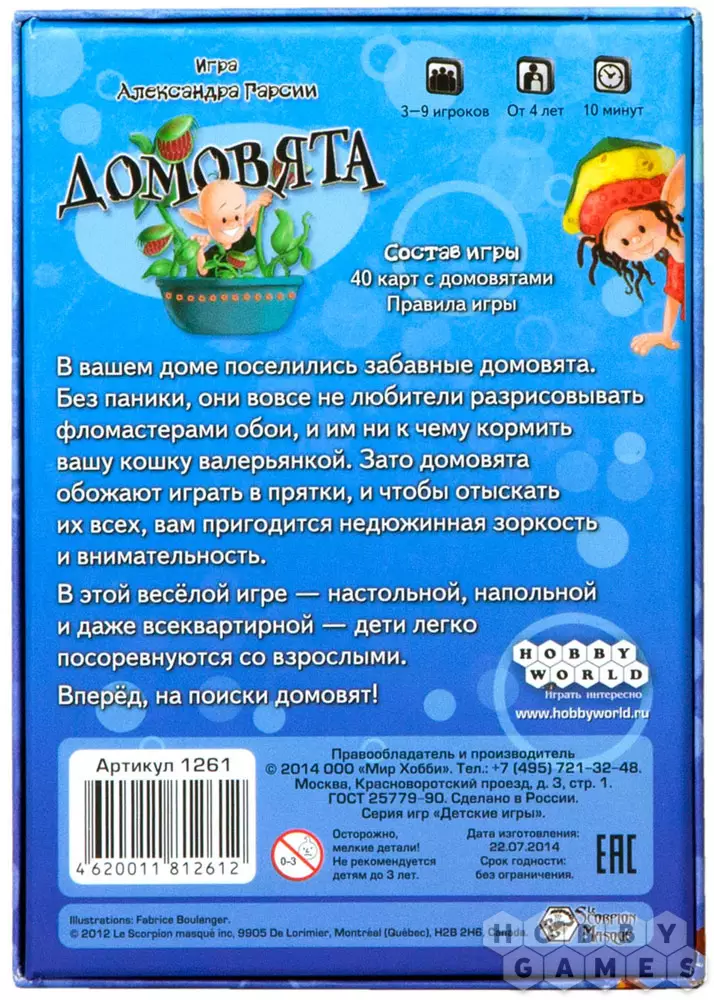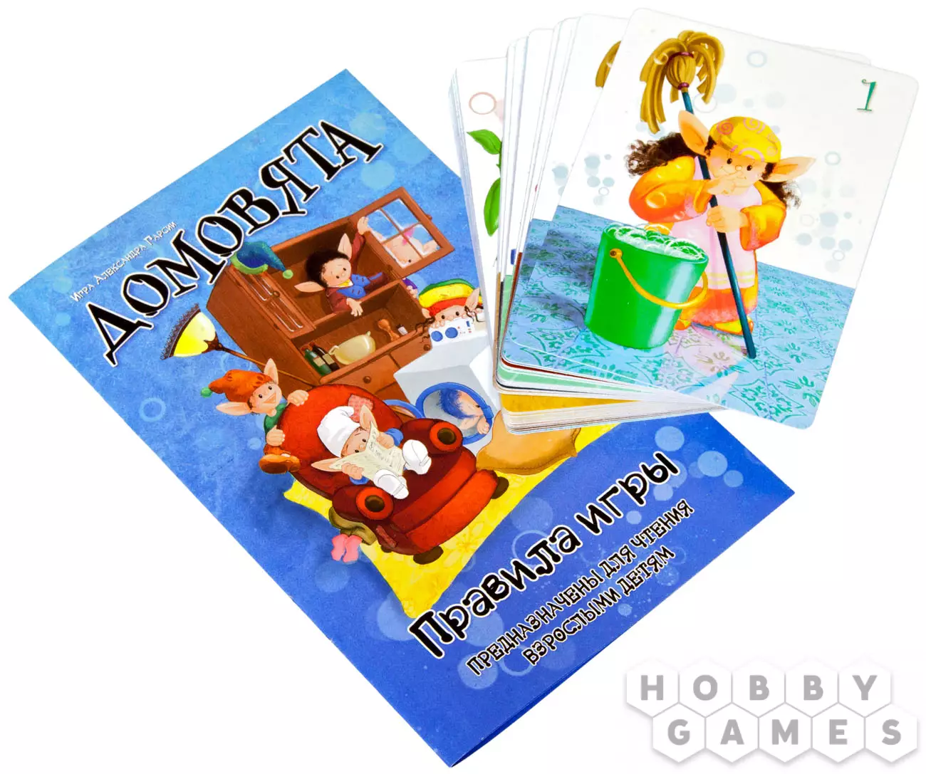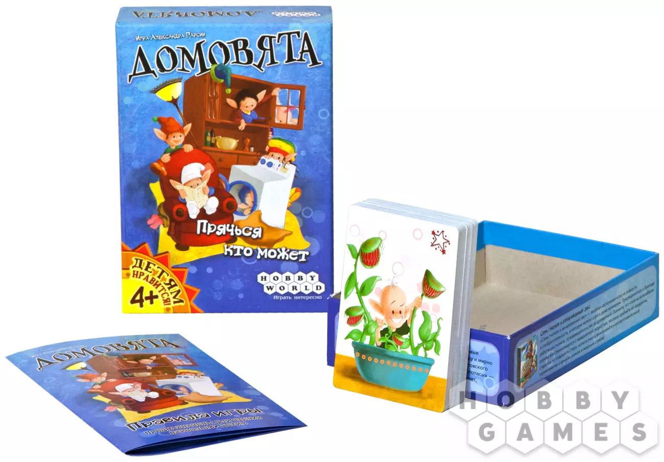 В карточную игру "Домовята" нужно играть не на столе, а в целой комнате или даже квартире! Игра предлагает сразу несколько вариантов правил: "Хозяин комнаты", "Теперь дом наш!" и их варианты со специальными домовятами-проказниками, усложняющими игру. Вы сами можете договориться, можно ли ведущему Хозяину давать подсказки ("горячо"-"холодно"), а также о времени, которое даётся игрокам на поиск спрятанных домовят. Кто именно будет помогать спрятаться нашим домовятам – сами игроки или, например, родители – зависит от выбранных вами правил.