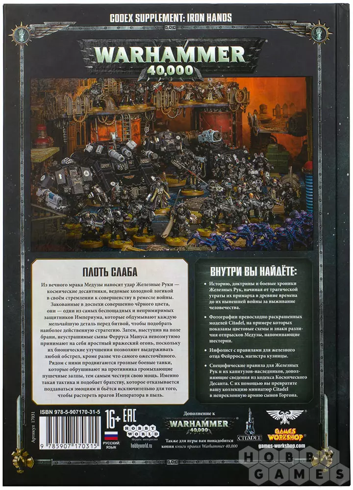 Железные Руки (Iron Hands) обрели единение с машиной. Они являются самыми стойкими и неустанными из всех Адептус Астартес и готовы показать превосходство своей аугметики в битвы, доказывая тем самым, что плоть слаба. В этом приложении к кодексу Космического Десанта шестьдесят четыре страницы, на которых находится всё, что вам необходимо для раскрытия потенциала Железных Рук в бою, а также захватывающие истории и иллюстрации, которые вдохновят вас на создание собственной коллекции.