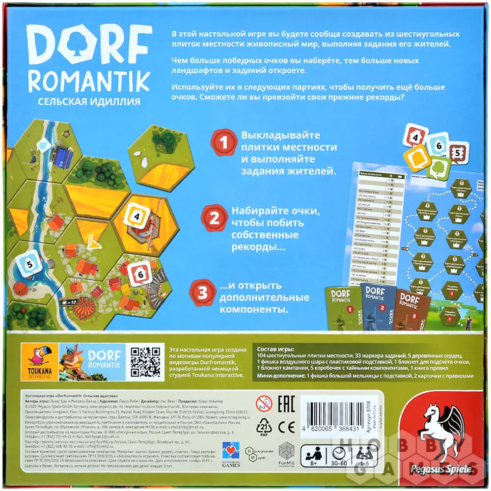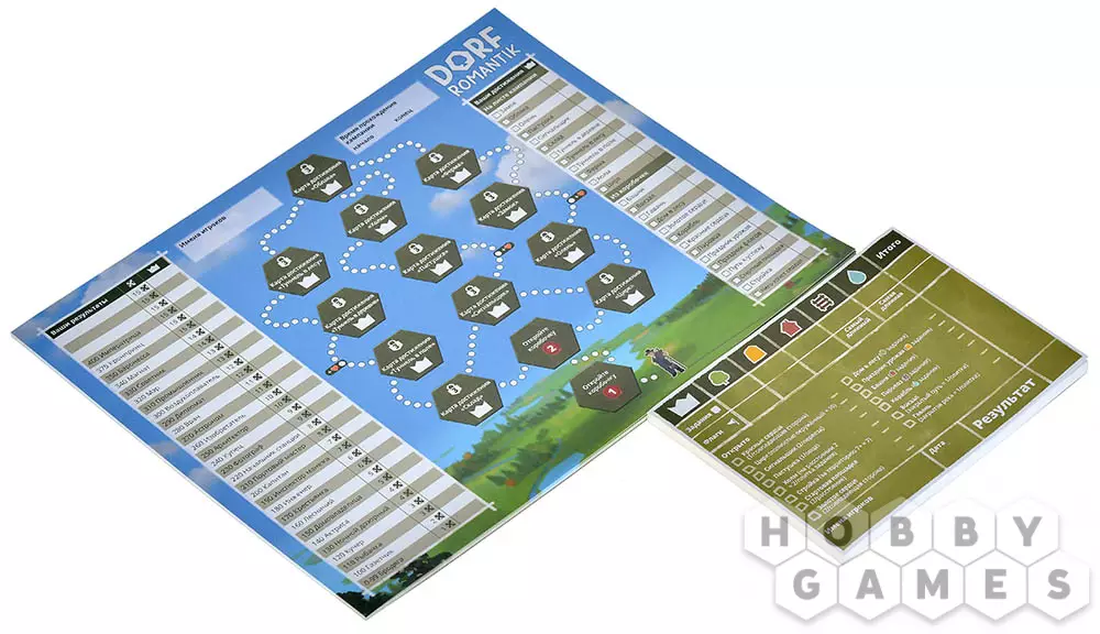 "Dorfromantik: Сельская Идиллия" – это настольная кооперативная игра, в которой участникам предстоит создавать красочные сельские пейзажи посредством размещения шестиугольные плиток. Главная цель всех игроков – выполнить пожелания жителей, построить самые длинные реки и протяжённые железнодорожные маршруты, а также учесть дополнительные условия, обозначенные на специальных флагах. Успешное выполнение задач приносит очки, которые накапливаются в рамках кампании (она доступна для повторного прохождения). Заработанные очки можно тратить на открытие особых коробочек, внутри которых содержатся новые игровые элементами. Эти дополнения вводят свежие задания, делая процесс ещё интереснее и расширяя горизонты возможностей!