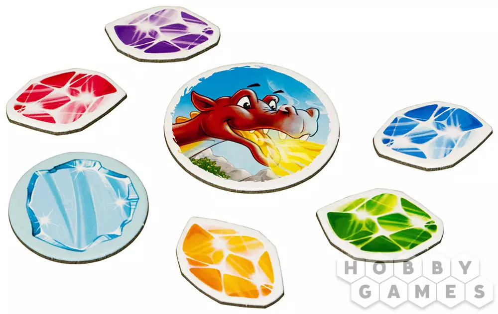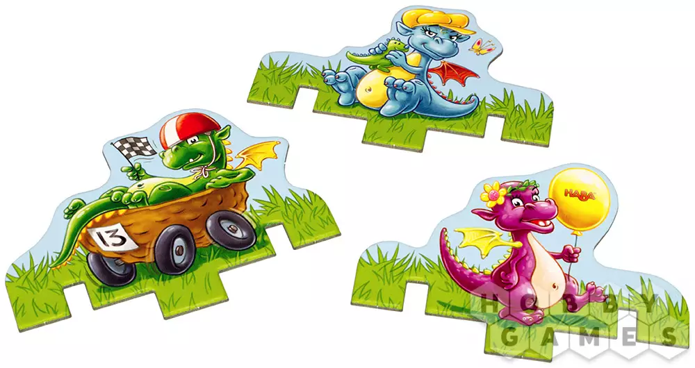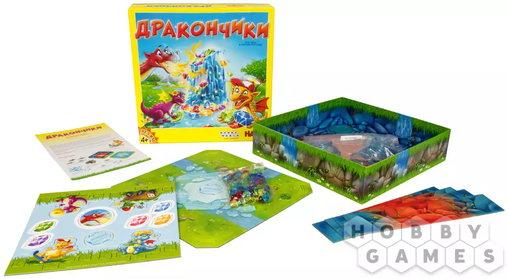В комплекте вы найдёте игровое поле с прорезями, под которым будут находиться пещеры дракончиков и папы-дракона, специальную башню, которая состоит из девяти колец, лежащих друг на друге, и драгоценные камни пяти цветов, которые эту башню наполняют.