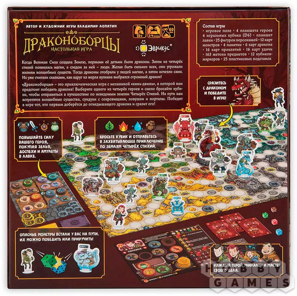 "Драконоборцы" – приключенческая настолка, где участники будут развивать своих героев, управлять монстрами своей стихии и бросать вызов оппонентам, и в результате предпримут отчаянную попытку победить последнего дракона. А уж тот, кто сможет совершить такой невероятный подвиг, навечно впишет своё имя в летописи и легенды о нём будут передаваться из уст в уста ещё долгое и долгое время!