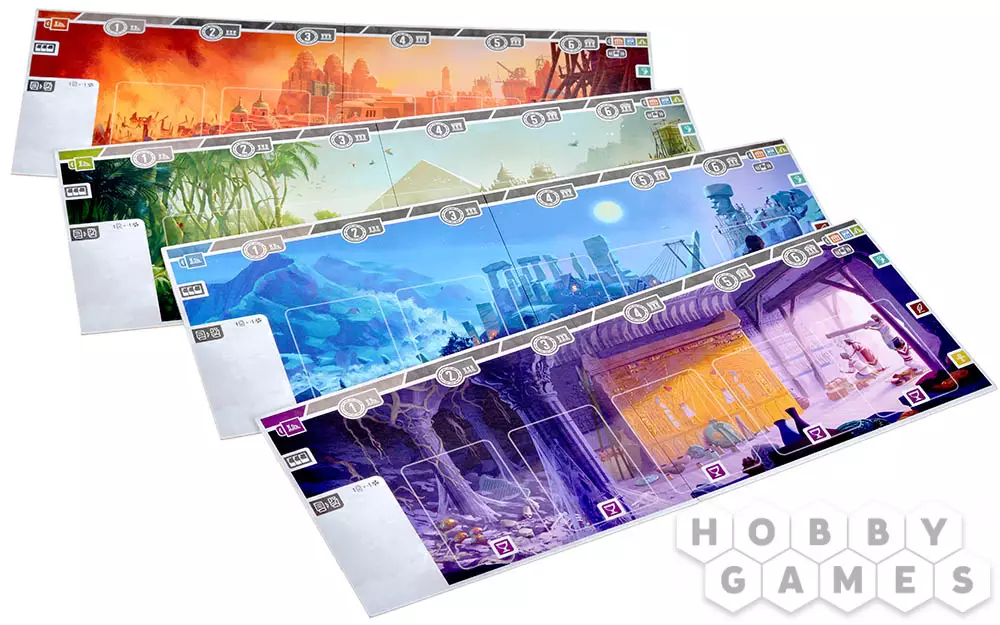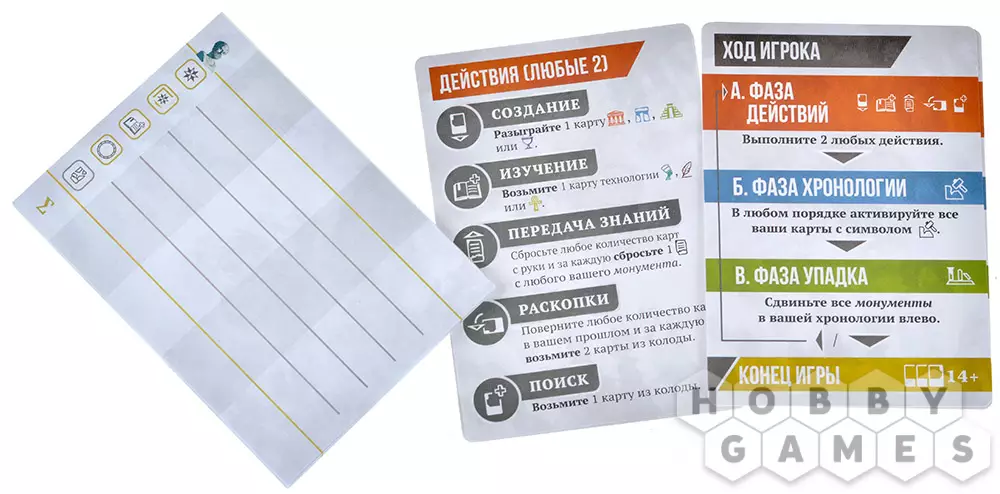 Игроки получают планшет строителя. Вместе с пустыми пространством вокруг него они образуют игровую область состоящую из 5 зон: над планшетом образуется зона хронологии, куда разыгрываются карты монументов, зона слева от планшета – это прошлое, куда по истечении времени отправляются карты монументов. 5 ячеек на самом планшете являются зоной артефактов. Справа от планшета игроки хранят карты технологий, а слева снизу планшета находится пятая зона – зона утраченных знаний: туда помещаются все получаемые в процессе игра жетоны.
