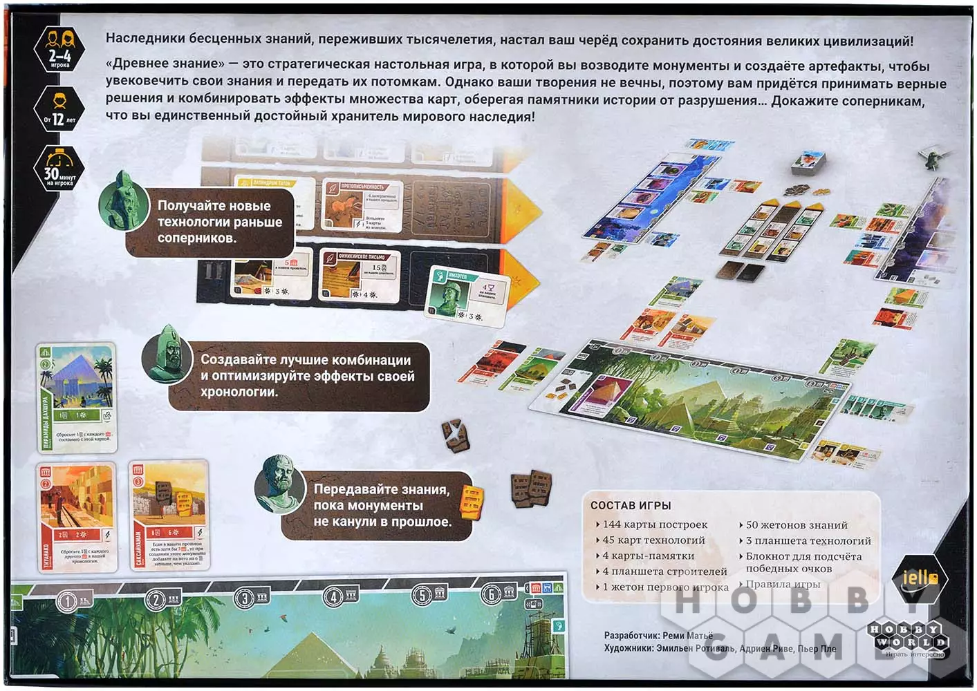 В настольной стратегической игре "Древнее знание" вам предстоит создавать артефакты и возводить монументы с целью увековечить свои знания для потомков. Но ничто не вечно, в том числе и ваши творения. Чтобы сохранить как можно больше знаний, необходимо эффективно комбинировать свои карты и принимать непростые решения. Попробуйте доказать своим соперникам, что именно вы являетесь достойным хранителем древних знаний!