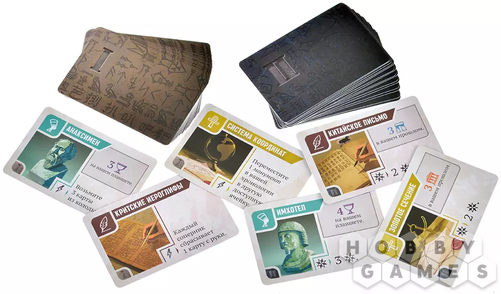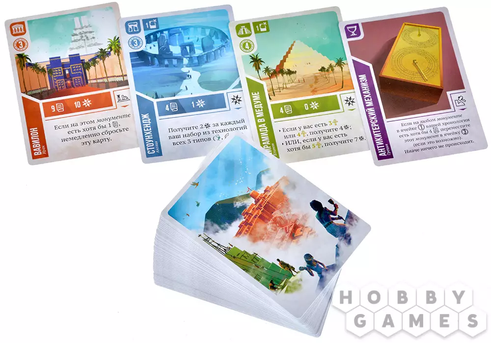 В игре 2 типа карт: постройки и технологии. Вначале партии каждый игрок получает на руки 10 карт и решает какие 6 оставить. Остальные 4 отправляются в сброс. Теперь вы готовы к строительству великого наследия!