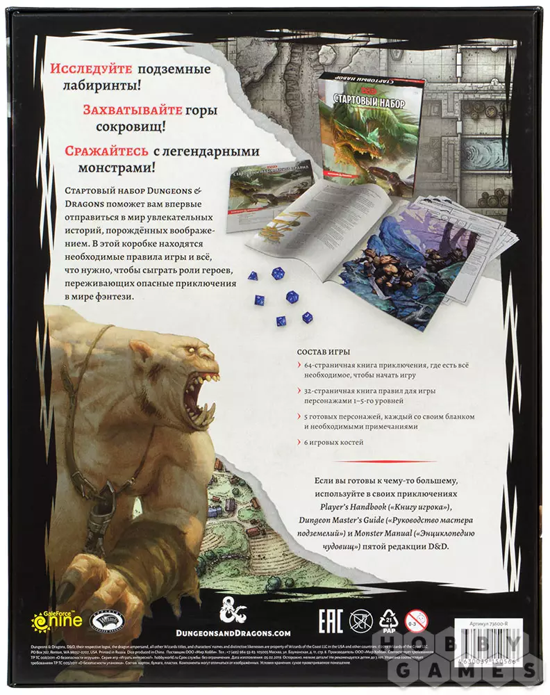 "Dungeons & Dragons. Стартовый набор" – это идеальный набор, которые содержит в себе всё, чтобы отправиться в путешествие пятерым отважным героям! Комплект содержит книгу правил для игроков, книгу приключений для Мастера Подземелий, пять готовых персонажей со своими бланками и набор необходимых для игры костей.