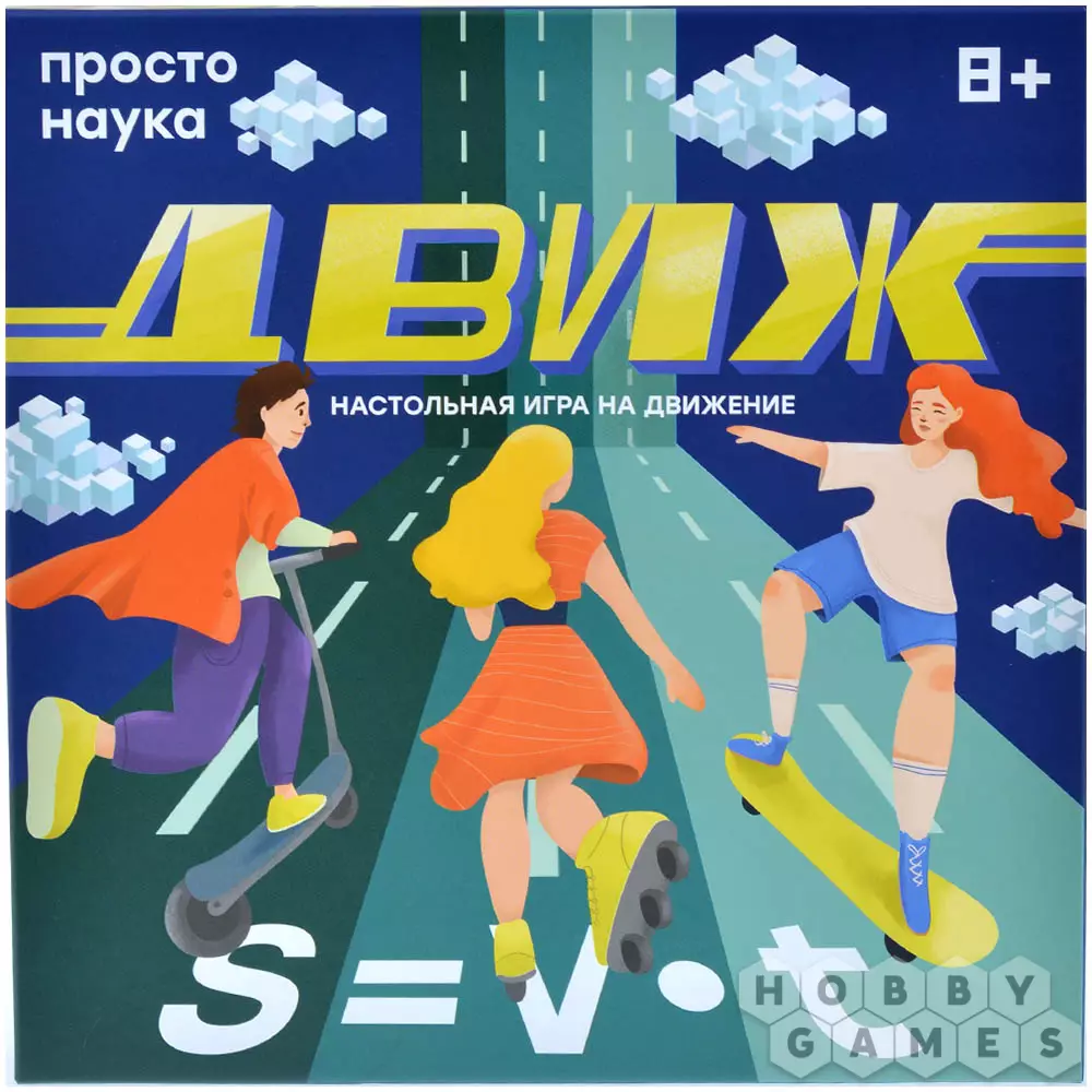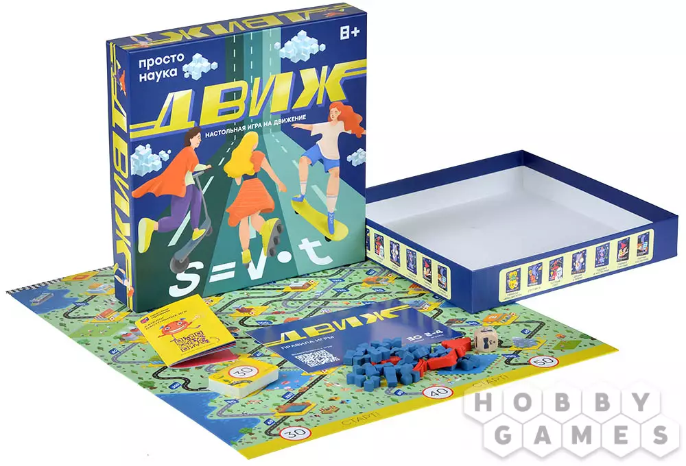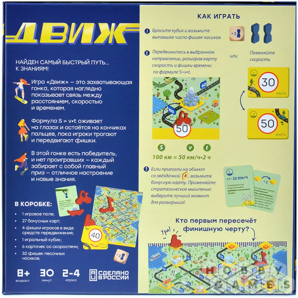Настольная игра "Движ" – это увлекательная образовательная гонка, которая объяснит юным игрокам, как связаны между собой время, расстояние и скорость. Простая математическая формула S=V×t превращается в захватывающий и азартный игровой процесс. Самое главное – в этой игре не бывает проигравших, потому что все участники гонки получают самый ценный приз – новые знания!