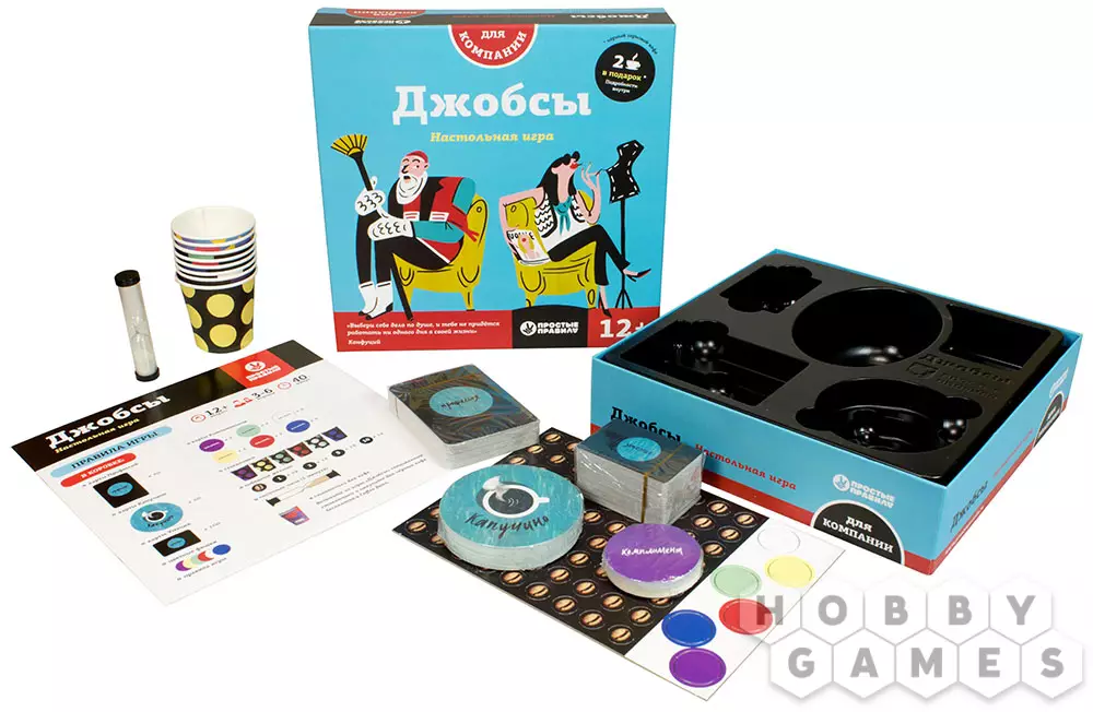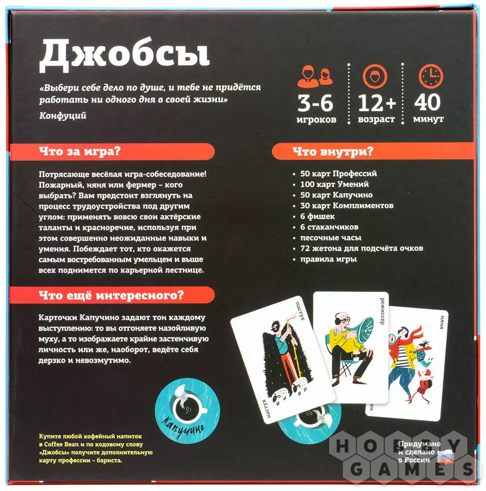 Настольная игра "Джобсы" – это самое необычное собеседование в вашей жизни, вне зависимости от того, работодатель вы или соискатель. В процессе игры, один из игроков становится работодателем, то есть ведущим раунда, и, проводит открытое собеседование, а все остальные игроки приходят к нему, как соискатели. Работодатель делает презентацию доступных вакансий для игроков, а они выбирают понравившуюся и выполняют тестовое задание. В конце раунда руководитель принимает решение о приёме или отказе, и все участники дарят друг другу комплименты, получают победные очки и начинают движение вверх по карьерной лестнице. Чем артистичнее и творчески вы преподнесёте себя, тем больше очков получите в результате.