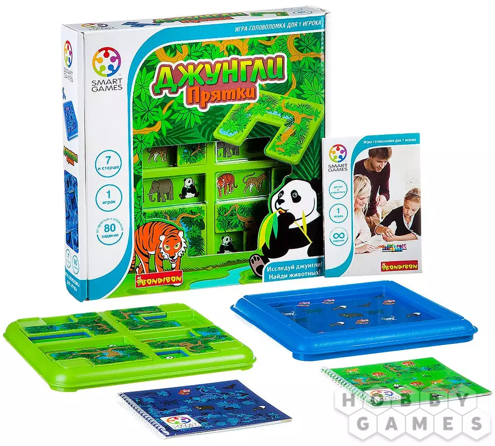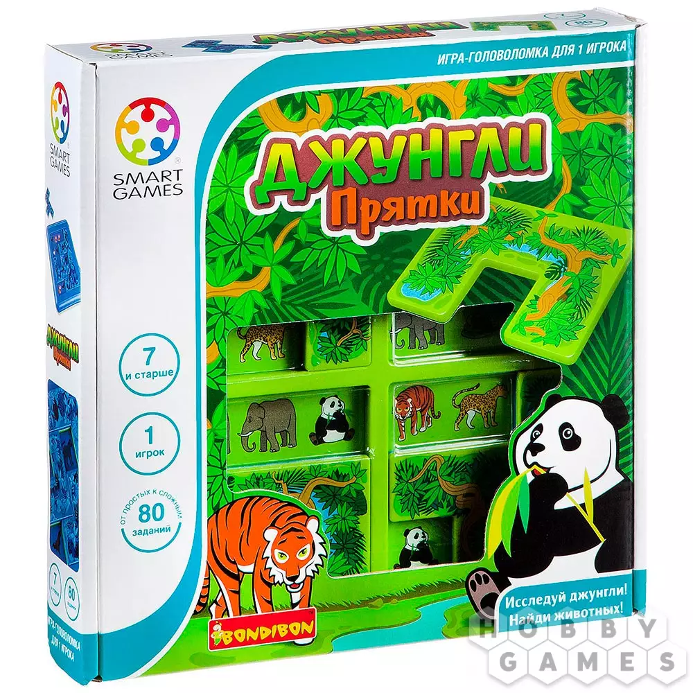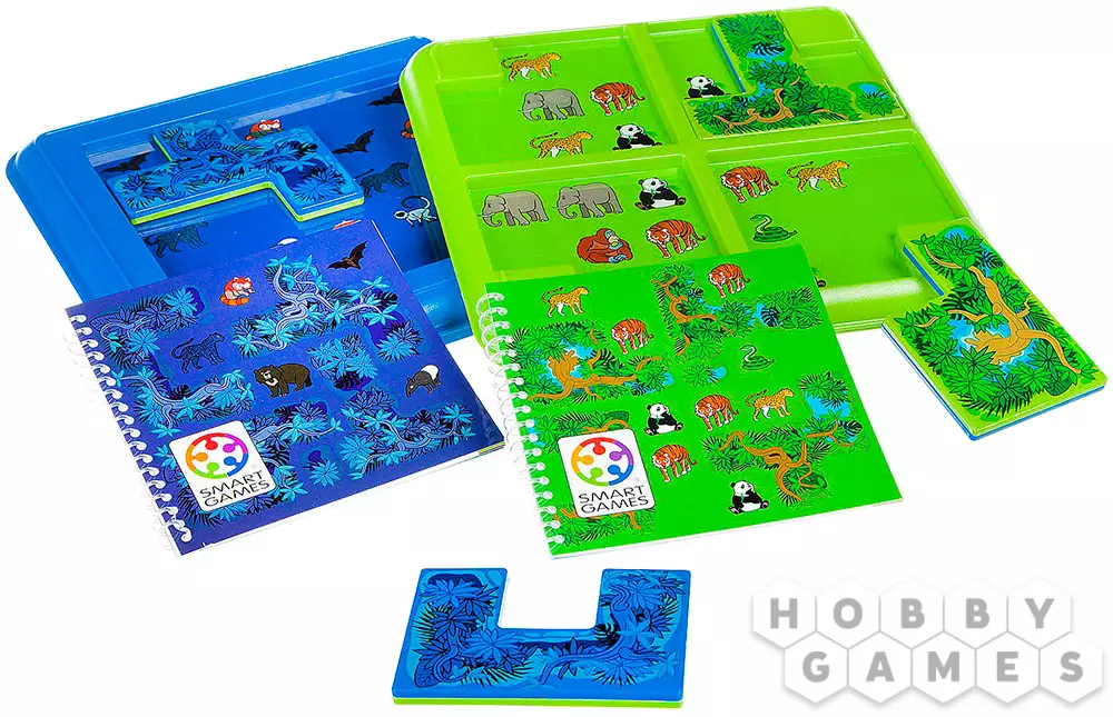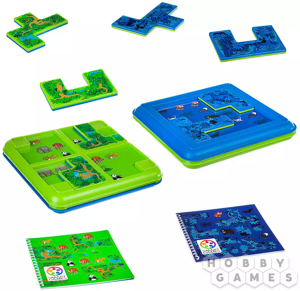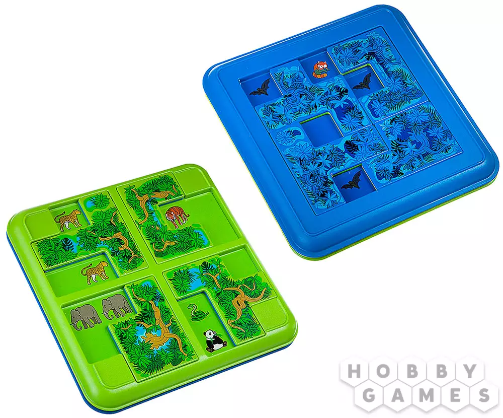 "Джунгли. Прятки" – это логическая игра-головоломка для детей, которая порадует каждого маленького фаната живой природы – ведь ему предстоит спрятать лишних обитателей тропиков так, чтобы остались только участвующие в задании. Для этого надо будет переставлять игровые элементы на планшете игрового поля. Кстати, игровых полей два – дневное и ночное. В дневном несколько игровых областей и задания попроще, а в ночном они сложнее, а игровое пространство не разделено. Настольная игра "Джунгли. Прятки" поможет ребёнку развить своё логическое мышление, а ещё зрительные и пространственные способности. Скорее прячьте тигра!