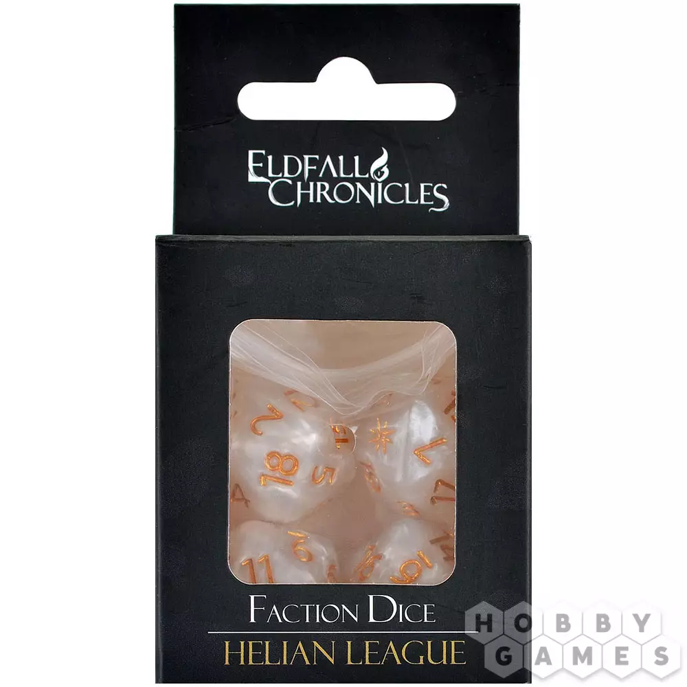Этот набор включает 4 перламутровых кубика, выполненных в цветах фракции Helian League и украшенных её гербом. Уникальный дизайн подчёркивает принадлежность к фракции, делая игру ещё атмосфернее.