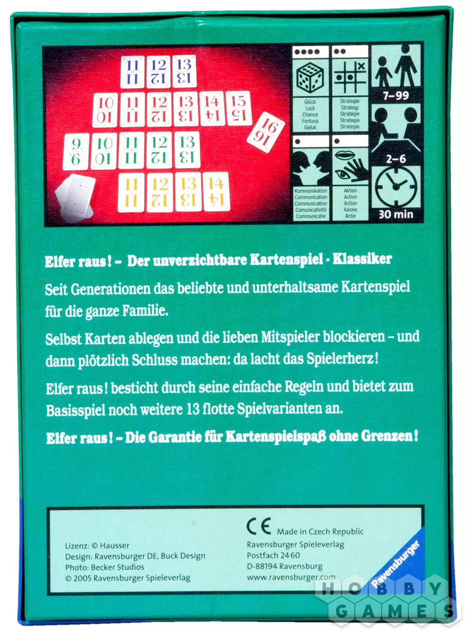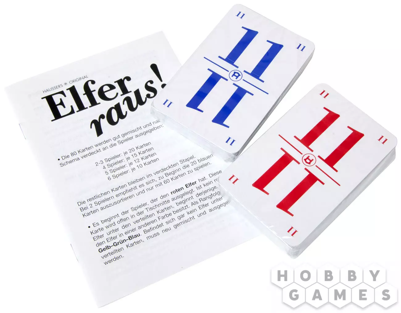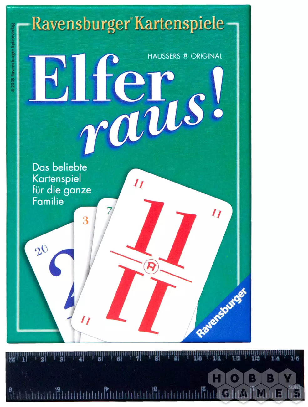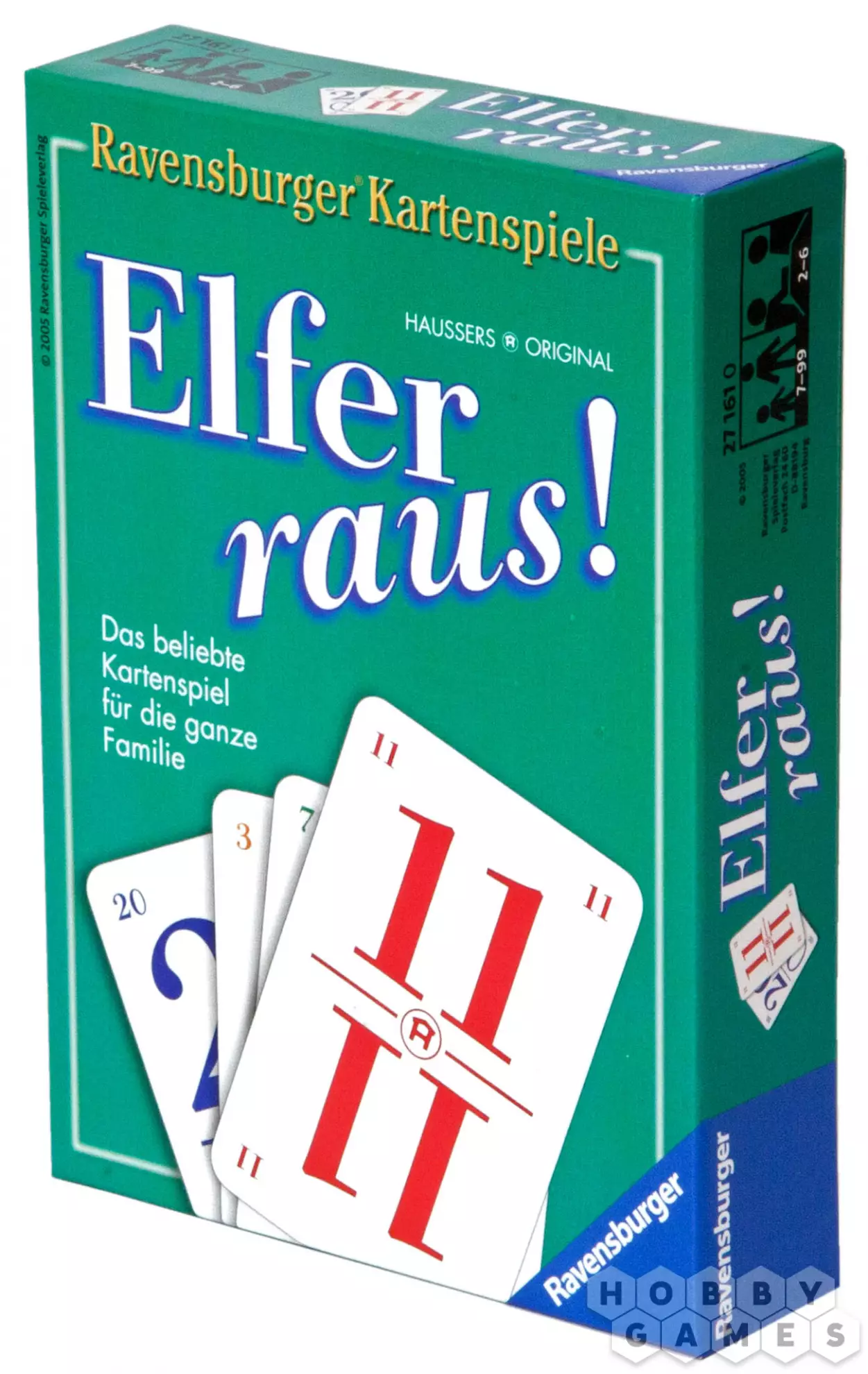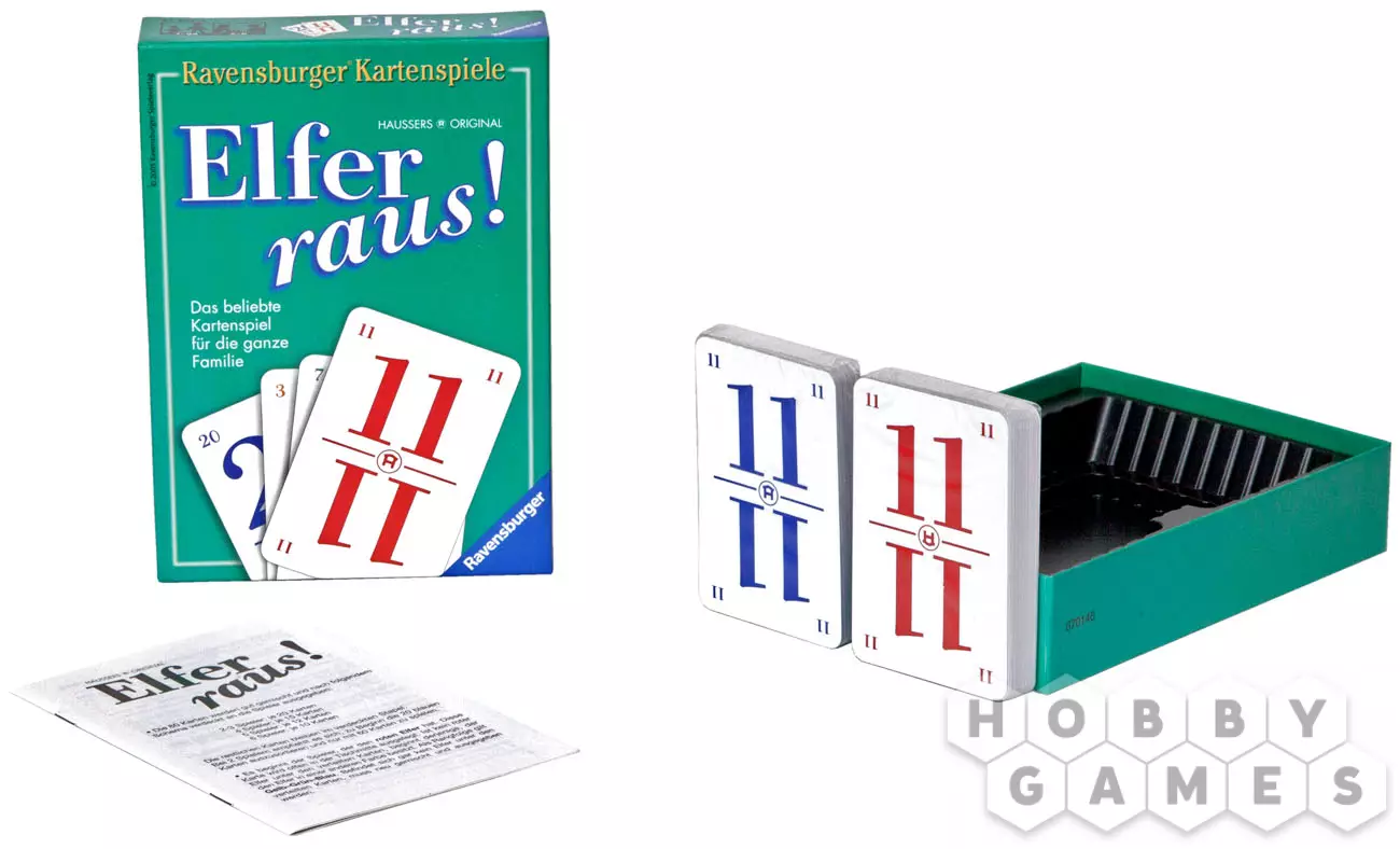 «Elfer raus!» или «Одиннадцать» — это всемирно известная игра пасьянс. Ваша задача — как можно быстрее избавится от своих карт, выстроив их в общую цепочку. Также в этой коробке вы найдёте правила ещё для тринадцати настольных игр, в которые можно сыграть с помощью этой колоды. Причём некоторые игры являются модификацией «Одиннадцати», а некоторые являются полностью самостоятельными играми.