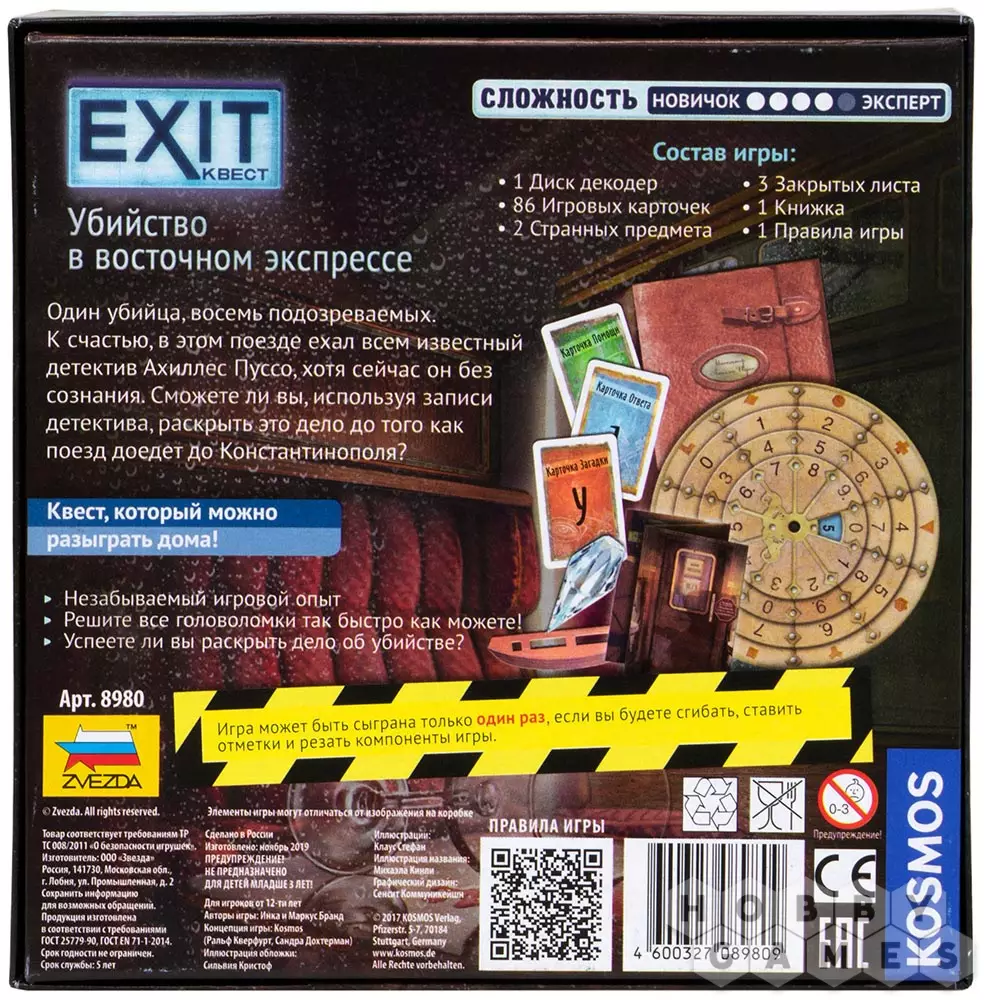 Серия игр "EXIT-Квест" основана на популярном жанре приключенческих квестов в реальности. Решив серию увлекательных и необычных загадок, вы сможете найти выход из опасной ситуации. Внутри каждой коробки вас ожидает незабываемая история и уникальное приключение для весёлой компании, обожающей логические задачки.