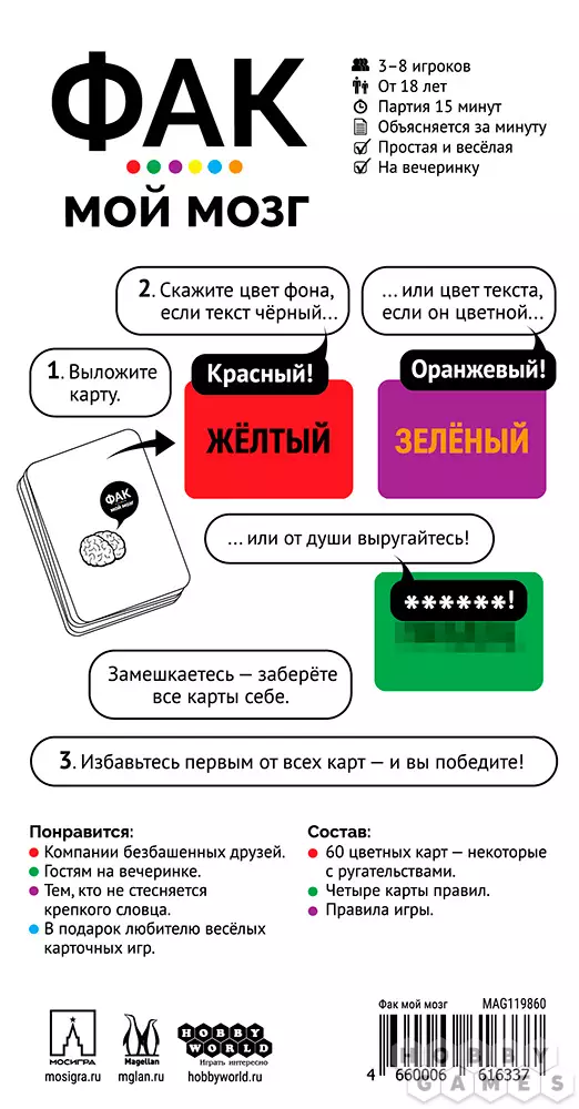 Ольга06.07.2023 19:18Недооценённый, на наш взгляд, и очень уморительный патигейм, способный привнести веселье в несколько шумных вечеров с друзьями. Принцип игры, вроде бы, абсолютно понятен, но все равно эта путаница на карточках по-настоящему взрывает мозг. Игра не для детских глаз и ушей из-за "красного" словца на половине карточек, но для взрослой компании посмеяться подойдёт. Цена и возможность играть достаточно большим составом - ее несомненные плюсы.