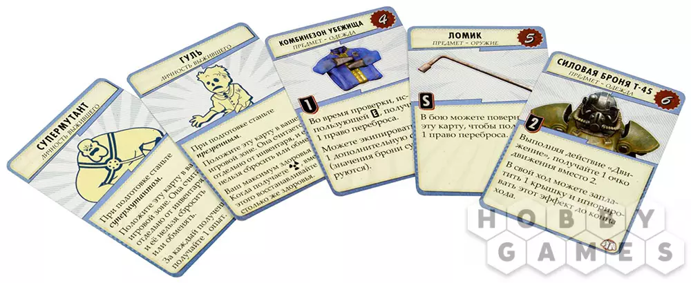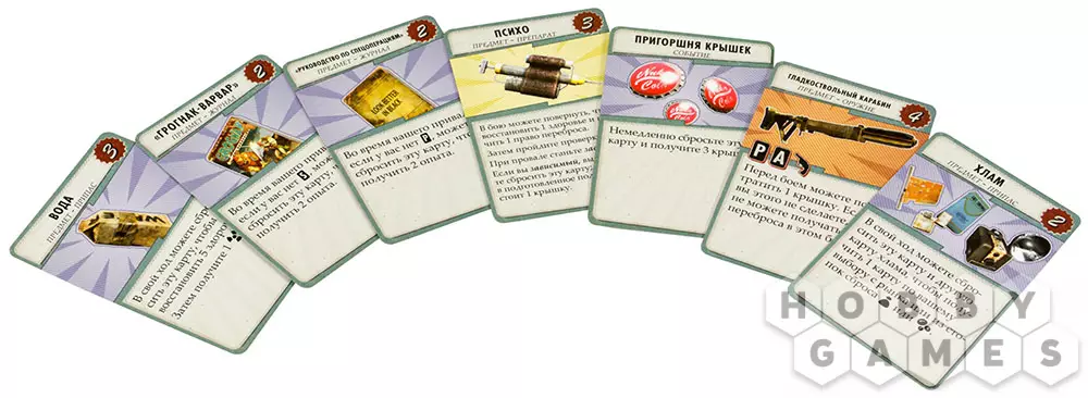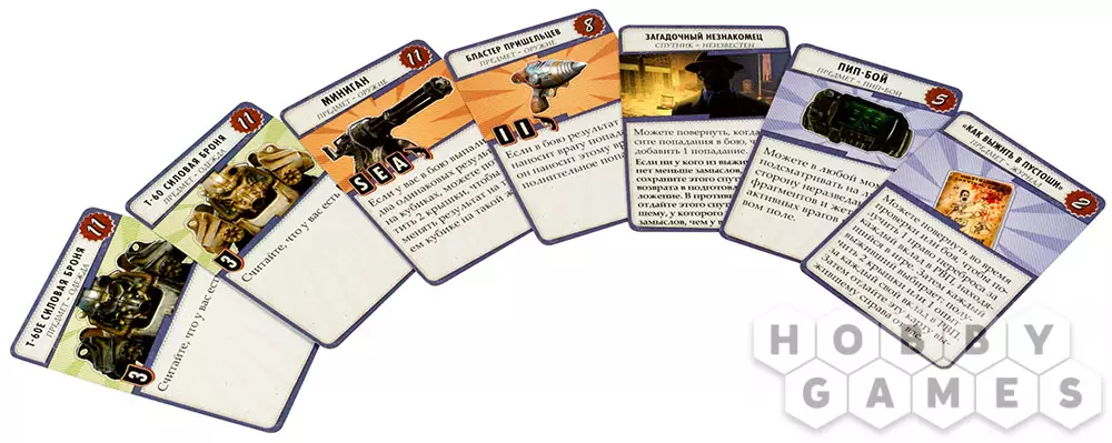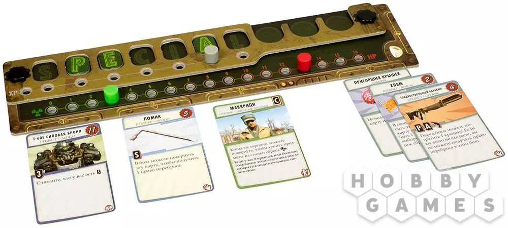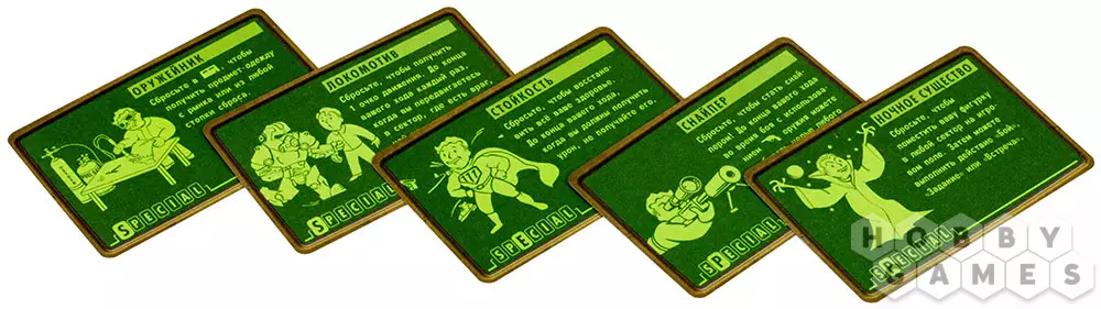 - Встреча – когда вы находитесь в локации со специальным значком, вы можете совершить это действие, чтобы вытянуть карту встречи или некоторого события. В поселениях у вас появится возможность торговли. При розыгрыше события вам придётся выбрать один из предложенных картой вариантов действий и пройти проверку характеристик. Да, фанаты порадуются, что здесь присутствует система "V.A.T.S." и "S.P.E.C.I.A.L.". Для проверок используются специальные кости и жетоны с характеристиками