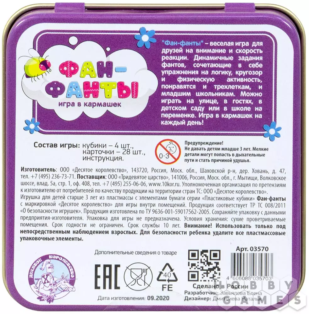 "Фан-фанты" – это динамичная настольная игра, которая проверит ваши реакцию и внимательность. Игровой процесс включает в себя логические и физические задания, а также задания направленные на расширение кругозора. Все компоненты игры хранятся в небольшой коробочке из жести, которую удобно взять с собой, поэтому в "Фан-фанты" можно играть где угодно!