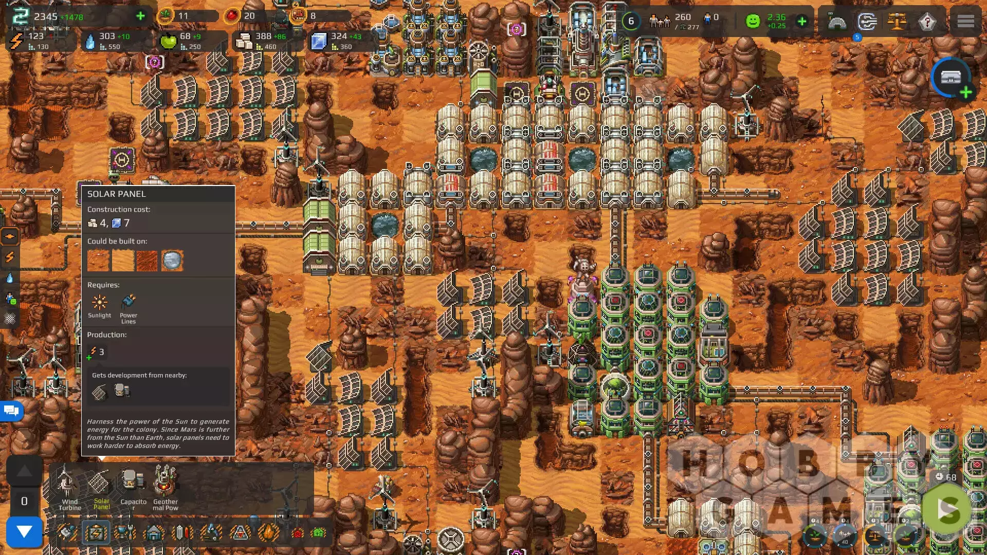Создайте жизнеспособную среду обитания для своих поселенцев, строя водяные насосы, обустраивая фермы на плодородной земле, используя энергию солнца и добывая ценные минералы. Обязательно тщательно спланируйте строительство. Расположение каждого здания обеспечит дополнительные бонусы в зависимости от их расположения. Например, размещение ветряной турбины вблизи гор обеспечит увеличение выработки электроэнергии.