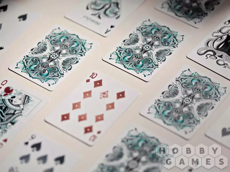 Определенно, серия "стихийных" карт станет флагманом студии. Дизайн досконально проработан. Объемные капли формируют узор рубашки, лица карт-картинок состоят из больших и маленьких пузырьков воздуха, русалки своими телами рисуют элегантный Пиковый Туз, а с Джокеров холодными глазищами смотрит сам Кракен! Лучшие наработки за год в карточной индустрии собрались в одной колоде – Fathom.