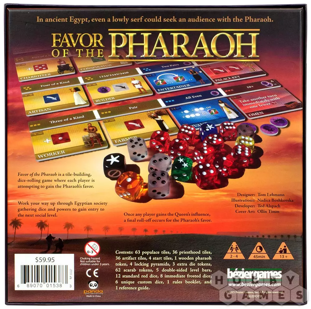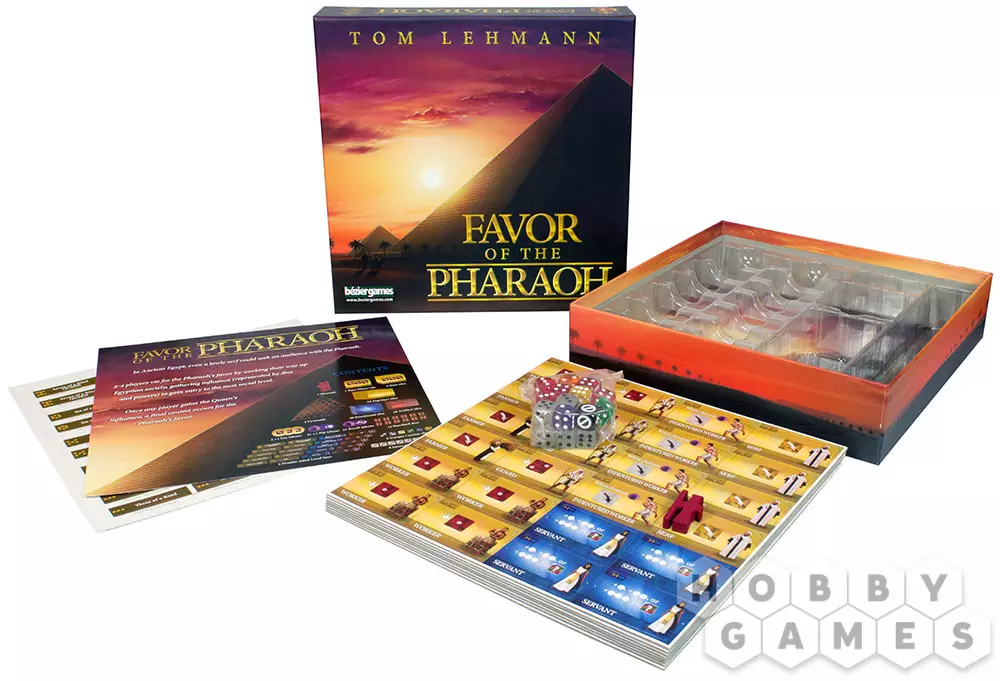 В Древнем Египте даже скромный крестьянин имел право удостоиться аудиенции у фараона. Ради этой аудиенции игроки и борются, пробираясь через египетское общество, собирая влияние, чтобы получить доступ к следующему уровню развития. Как только один из игроков добирается до вершины, происходит финальное состязание на пути к Фараону. В настольной игре Favor of the Pharaoh Вы, с помощью кубиков и карт, выстраиваете свою карьерную лестницу к самому Фараону.
