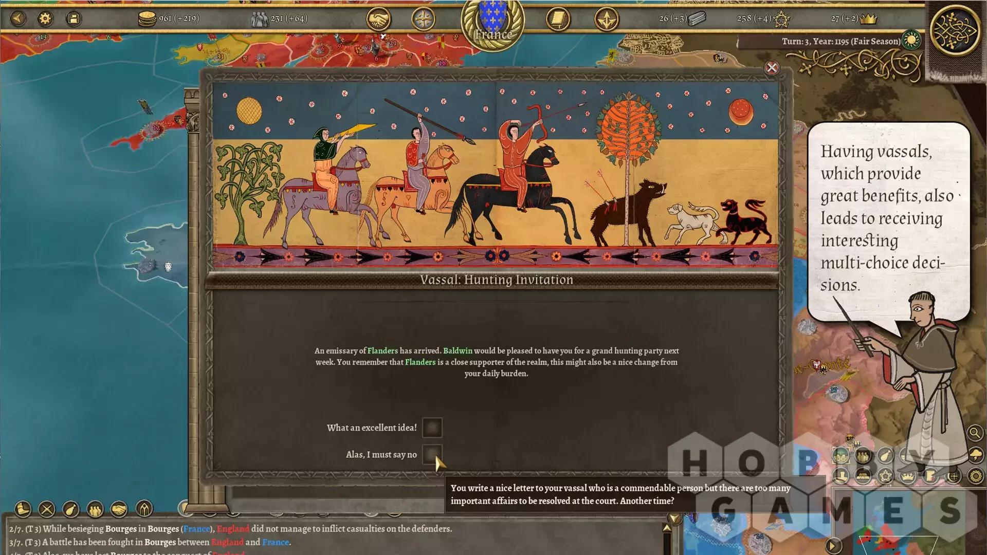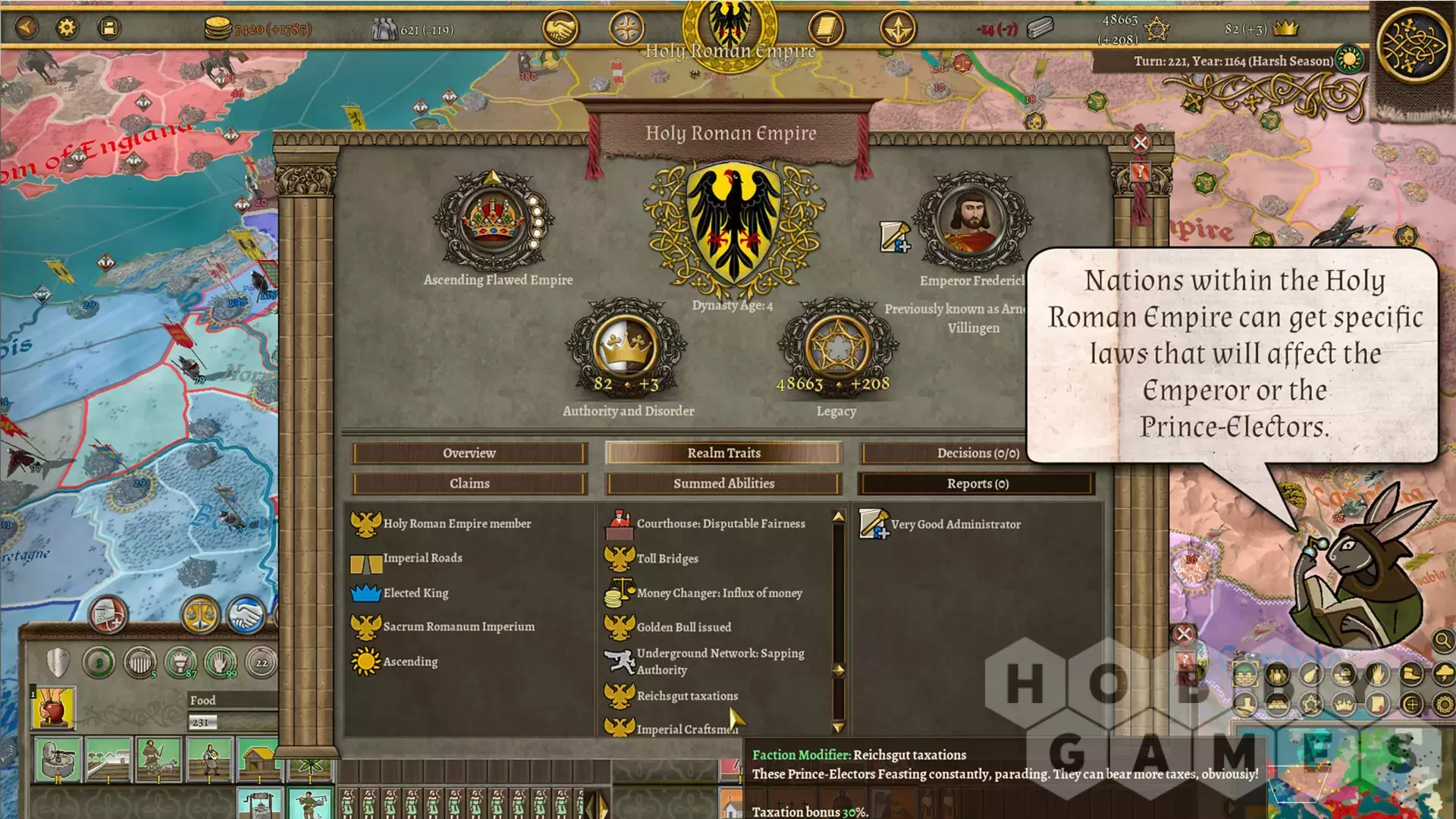 Управляйте своим королевским доменом с помощью новой концепции полномочий. Держите свое население и вассалов под контролем, издавайте указы о строительстве зданий и объявляйте войны своим врагам.