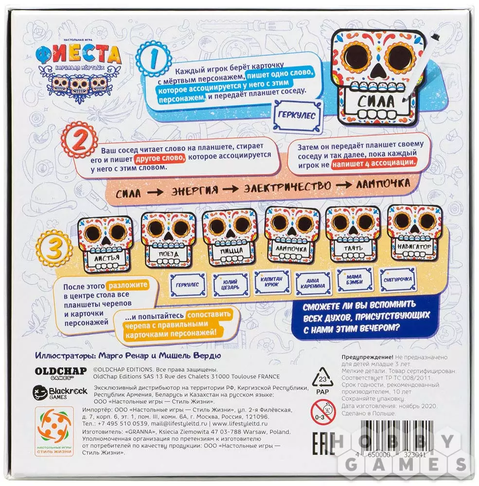 "Фиеста. Карнавал мёртвых" – это настольная игра для вечеринки, участники которой действуют заодно, используя как возникающие у них ассоциации, так и обычную логику. Игрокам предстоит отгадать знаменитых персонажей из истории, литературы, мифологии и не только по ассоциируемому им слову – но не по простой ассоциации, а по искажённой "испорченным телефоном". Игра рассчитана на компанию от 4 до 8 человек и сделает вашу вечеринку ещё веселее – а заодно поможет получше узнать друг друга.