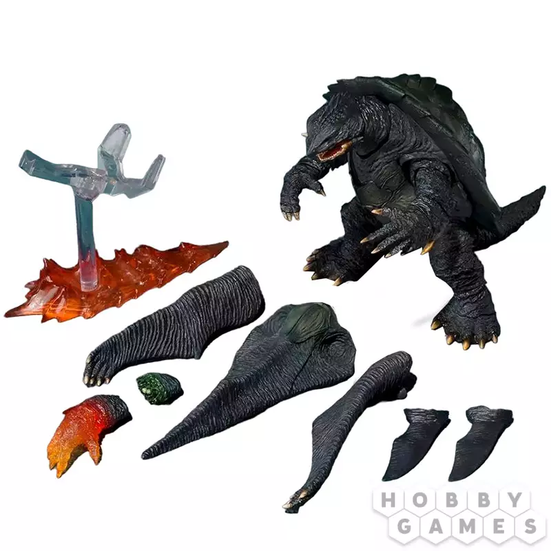 Фигурка Гамеры подвижная и оснащена большим количеством деталей. В наборе вы найдёте несколько вариантов крыльев, специальную подставку и хвост для воссоздания полёта, огненный кулак и даже повреждённую правую лапу для имитация нещадного боя.