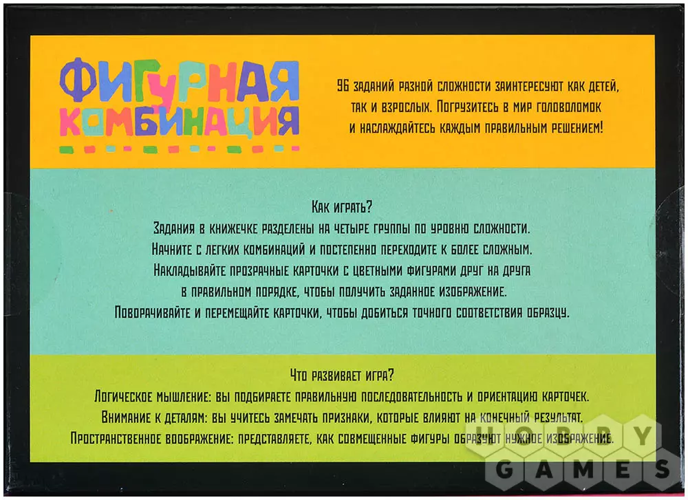 "Фигурная комбинация" развивает логическое мышление, внимание, пространственное воображение и даже мелкую моторику. Отличное развлечение для детей, которым как никому требуется всестороннее развитие, и для взрослых, которые любят интеллектуальные вызовы.
