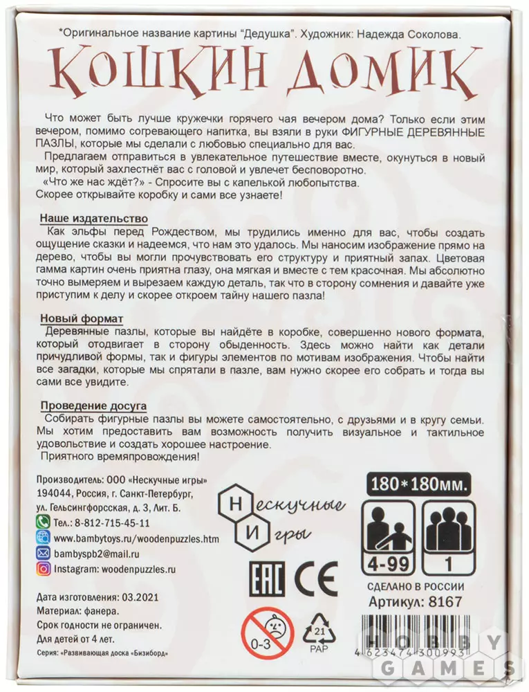 В небольшой коробке вы найдёте деревянные элементы, складывающиеся в изображение забавной картинки. Это уникальные пазлы, которые сохраняют естественный запах дерева, сделаны методом прямой экопечати. Фигурные детали делают процесс игры интереснее, так как они, несмотря на то, что являются частью целого, становятся самодостаточными элементами, которые любопытно разглядывать по отдельности.