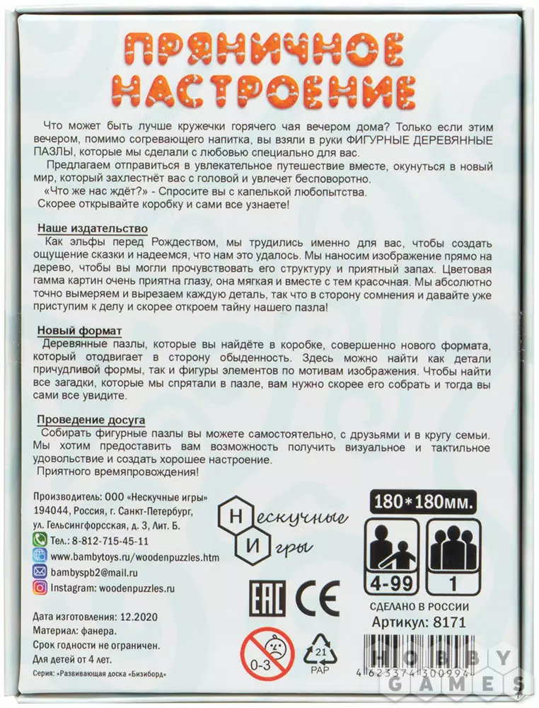 В небольшой коробке вы найдёте деревянные элементы, складывающиеся в изображение забавной картинки. Это уникальные пазлы, которые сохраняют естественный запах дерева, сделаны методом прямой экопечати. Фигурные детали делают процесс игры интереснее, так как они, несмотря на то, что являются частью целого, становятся самодостаточными элементами, которые любопытно разглядывать по отдельности.