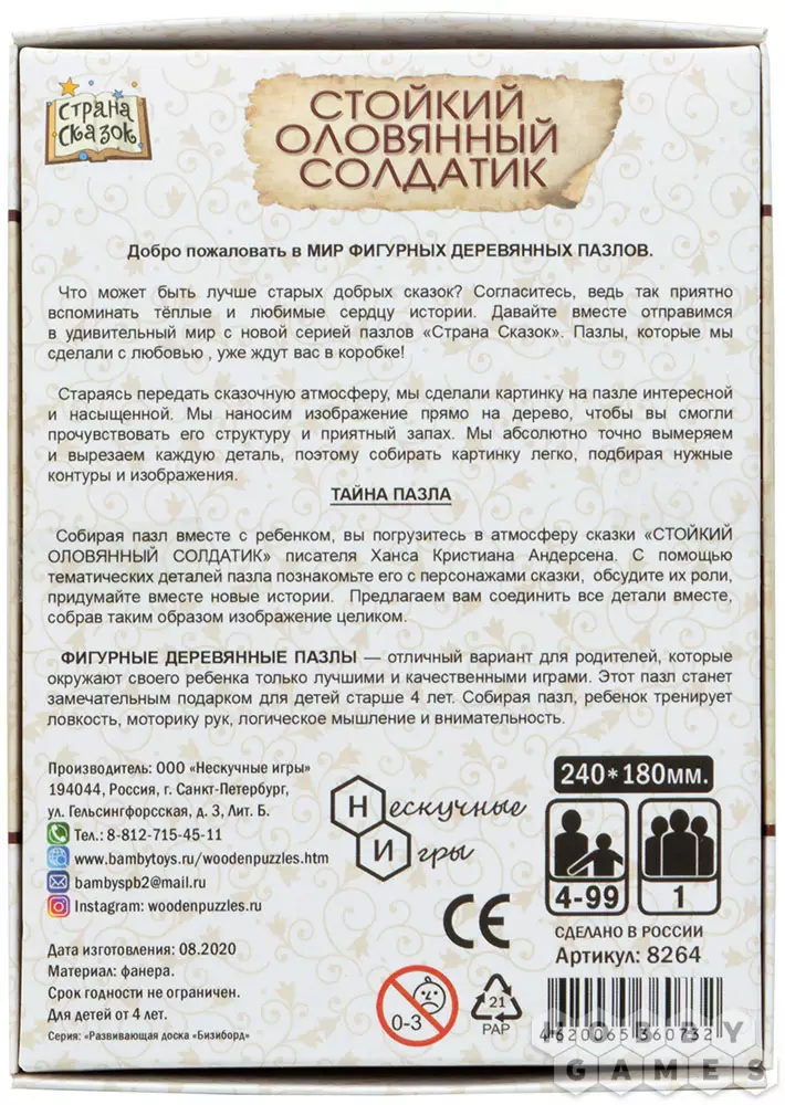 В небольшой коробке из серии "Страна сказок" вы найдёте деревянные элементы, складывающиеся в изображение одной из любимых с детства сказок. Перед вами уникальные пазлы, которые сохраняют естественный запах дерева и сделаны методом прямой экопечати. Фигурные детали делают процесс игры интереснее, так как они, несмотря на то, что являются частью целого, становятся самодостаточными элементами, которые любопытно разглядывать по отдельности.