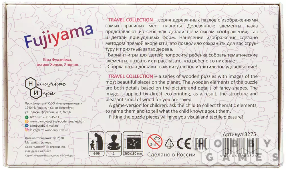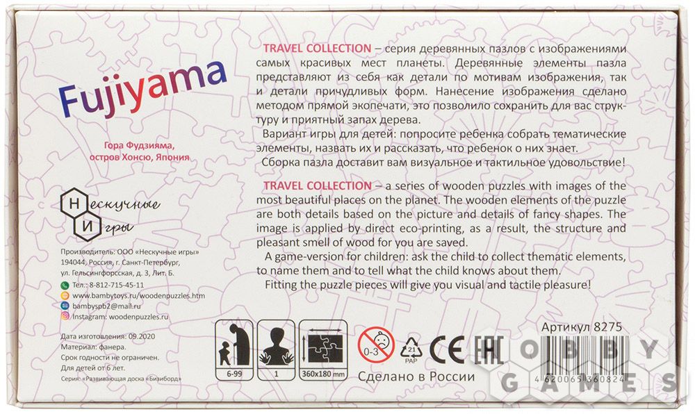 В небольшой коробке из серии Travel Collection вы найдёте деревянные элементы, складывающиеся в изображение одной из достопримечательностей мира. Это уникальные пазлы, которые сохраняют естественный запах дерева, сделаны методом прямой экопечати. Фигурные детали делают процесс игры интереснее, так как они, несмотря на то, что являются частью целого, становятся самодостаточными элементами, которые любопытно разглядывать по отдельности.