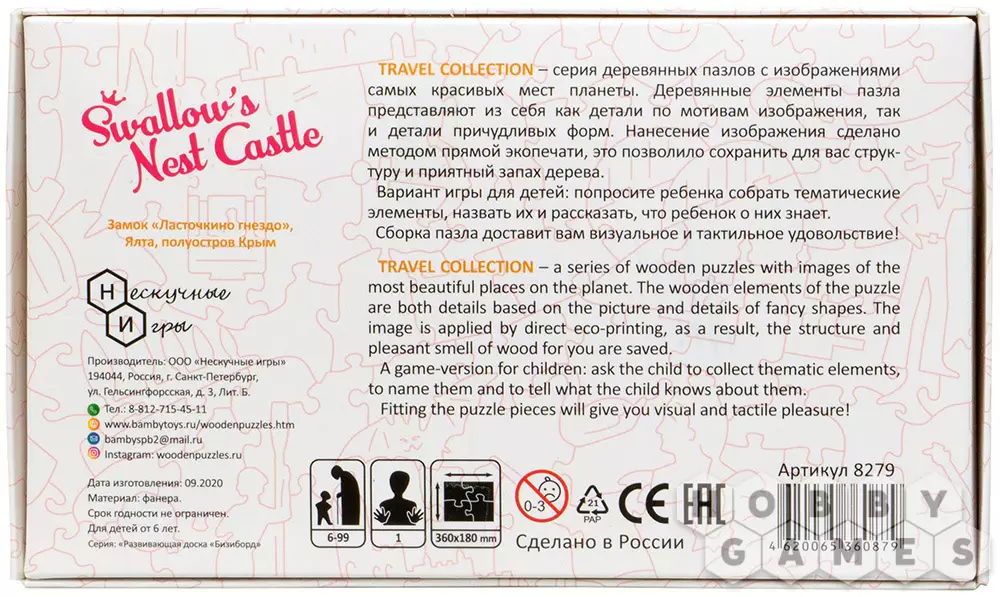 В небольшой коробке из серии Travel Collection вы найдёте деревянные элементы, складывающиеся в изображение одной из достопримечательностей мира. Это уникальные пазлы, которые сохраняют естественный запах дерева, сделаны методом прямой экопечати. Фигурные детали делают процесс игры интереснее, так как они, несмотря на то, что являются частью целого, становятся самодостаточными элементами, которые любопытно разглядывать по отдельности.