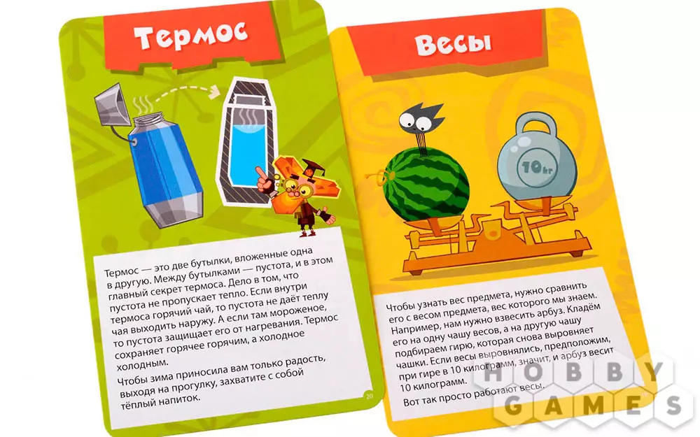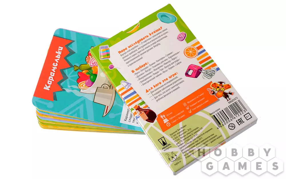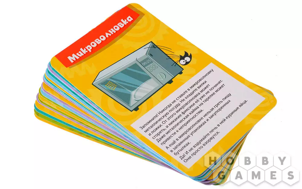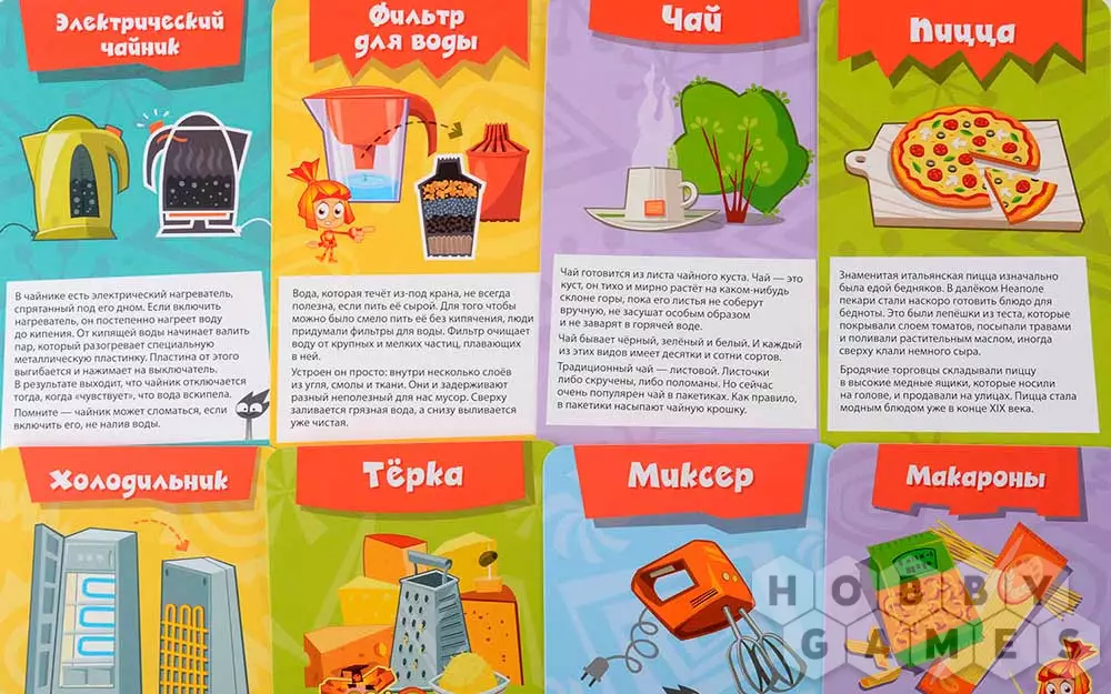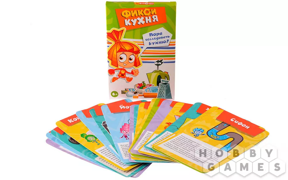 В коробочке с настольной игрой "Фикси-кухня" вы найдёте 21 карточку с описанием различных вещей, предметов и бытовых приборов, которые обычно "живут" на кухне. Из красочных карточек с любимыми мультгероями дети узнают, например, как устроен термос, что такое блендер, как появилась пицца и как работает электрический чайник.