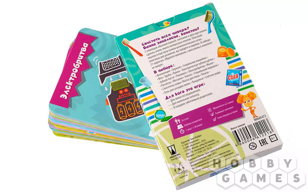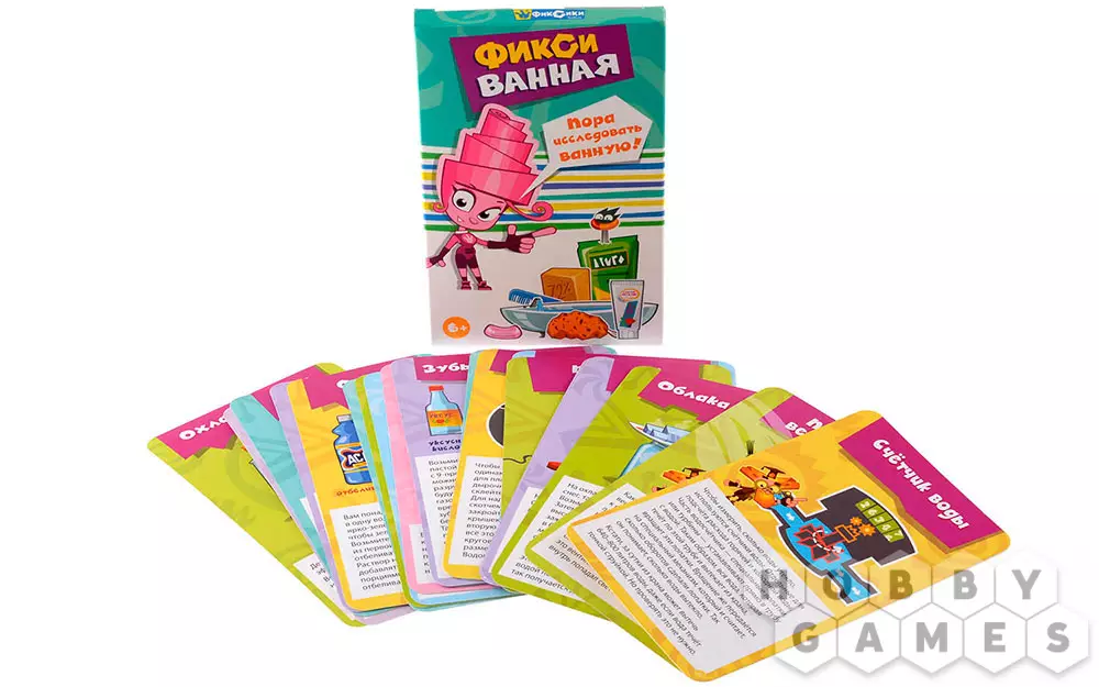 В коробочке с настольной игрой "Фикси-ванная" вы найдёте 21 карточку с описанием различных вещей, предметов и бытовых приборов, которые обычно "живут" в ванной комнате. Из красочных карточек с любимыми мультгероями дети узнают, например, как устроена электрическая зубная щётка, как работает вентиляция, и что такое смеситель воды.