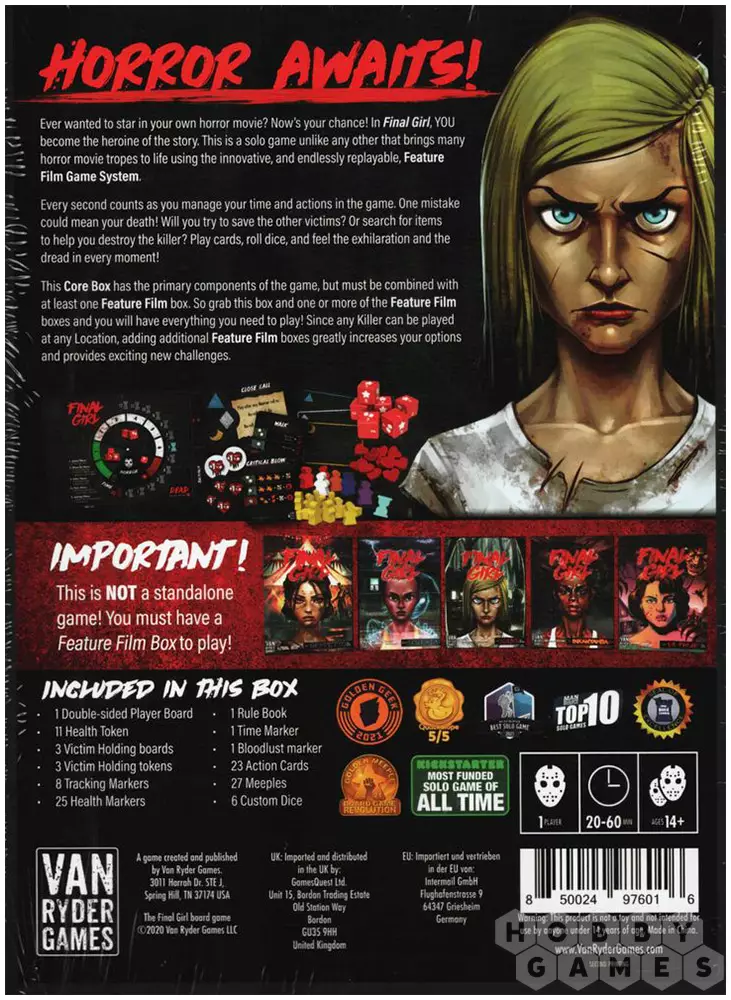 Final Girl: Core Box откроет вам дверь в этот будоражащий мир ужасов. Однако имейте в виду: в этой коробке вы найдёте все необходимые компоненты для игры, кроме самих "фильмов" – своеобразных сценариев-дополнений, которые вы можете "запустить" и которые приобретаются отдельно. Внутри каждого из них находятся уникальные локации, бесстрашные героини и импозантные убийцы со своими целями и характерами. При этом каждая партия – это новая история со своей динамикой и поворотами, ведь с кем и на какой территории сражаться, сочетая различные "фильмы", выбирать только вам. И чем больше кинокартин имеется в вашей коллекции, тем более непредсказуемым способен стать этот кошмар!