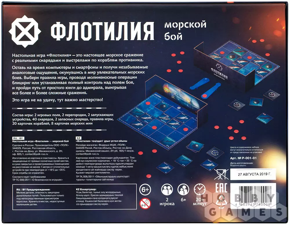 Наденьте мундир адмирала, возглавьте военный флот и сокрушите корабли противника в отрытом море! "Флотилия" – это обновлённая версия классической семейной игры, но с кардинально пересмотренными правилами. Теперь вы не пробуете угадать вслепую расположение противника, чтобы дальше его рассчитывать. Вместо этого в игре новая механика: нужно действительно попасть снарядом в корабль противника, воспользовавшись специальным метательным устройством. В правилах предусмотрено несколько уровней сложности, а специальные экраны предотвратят прямые попадания друг по другу. Рассчитайте баллистику снаряда, угодите точно в цель и затопите флот противника, яростно атакуйте в "блицкриге" и внимательно рассчитывайте вероятности в режиме на контроль моря. Покажите, кто лучший флотоводец!