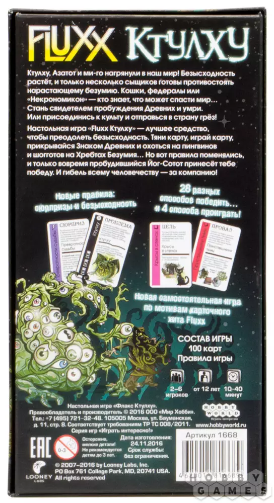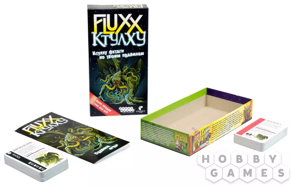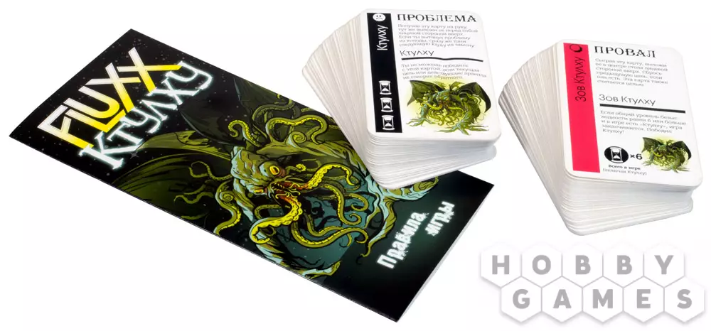 Юлия08.08.2019 17:21Fluxx по тематике Лавкрафта - самый шикарный в мире fluxx. :) Вроде бы смысл тот же, играется аналогично, но атмосфера совсем другая. Тянет быть тайным культистом!