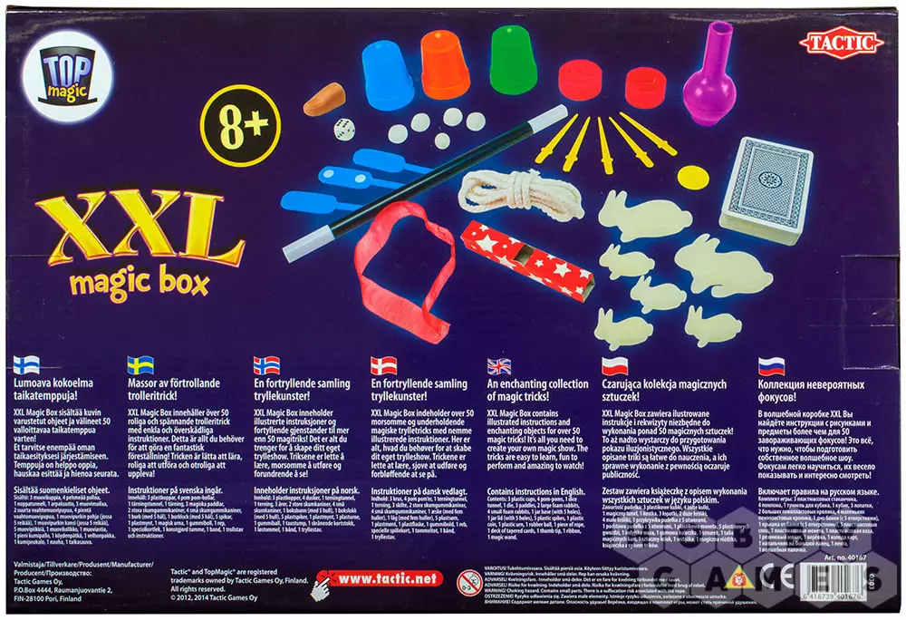 С помощью набора фокусов XXL Magic Box ваш ребёнок откроет для себя дивный мир волшебства и магии, а также сможет научиться различным трюкам. После чего, продемонстрировав их зрителям, малыш ощутит себя самым настоящим фокусником!
