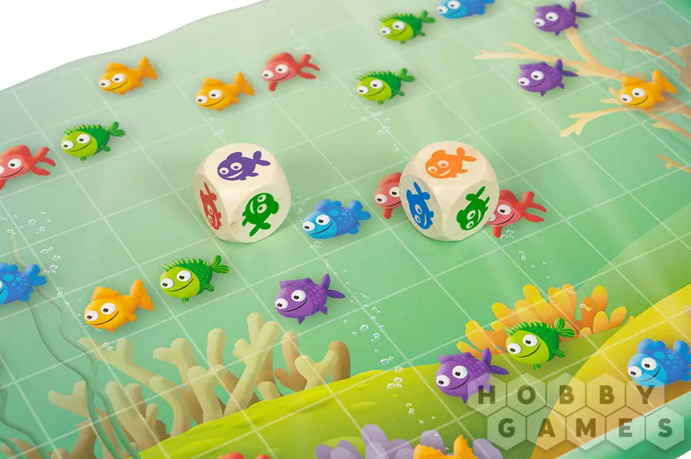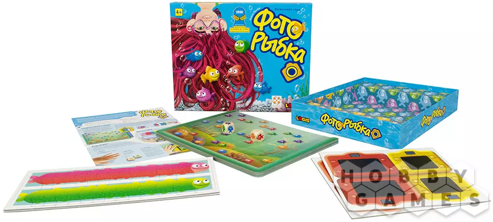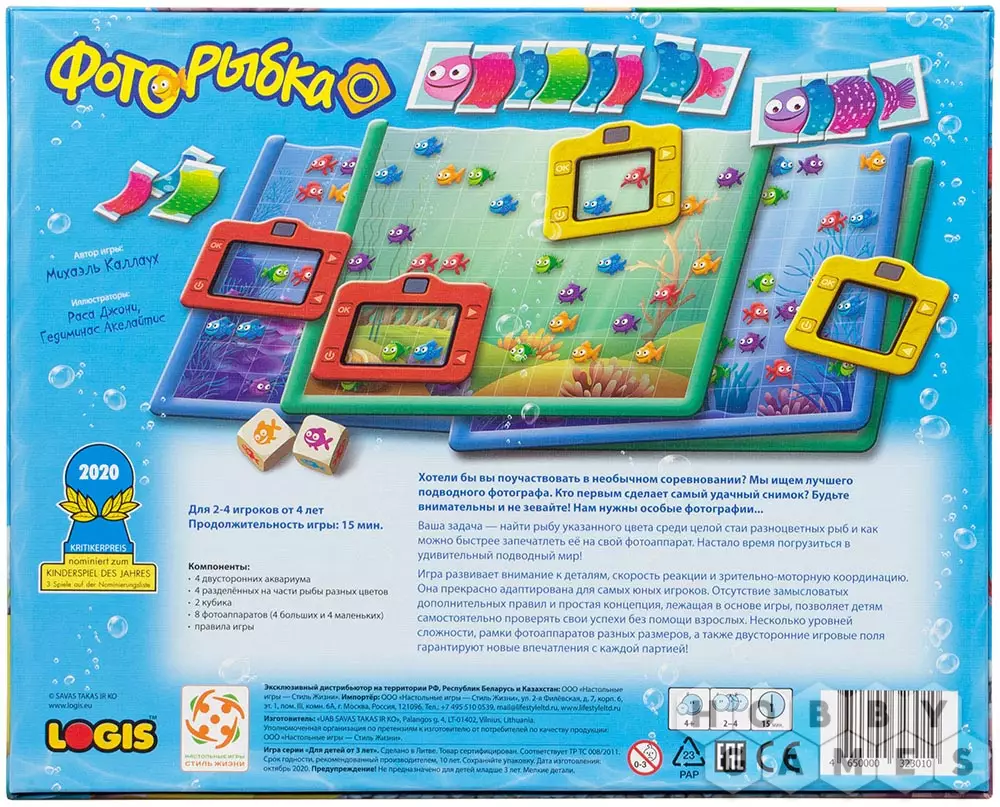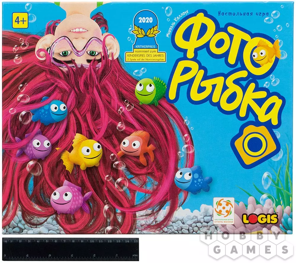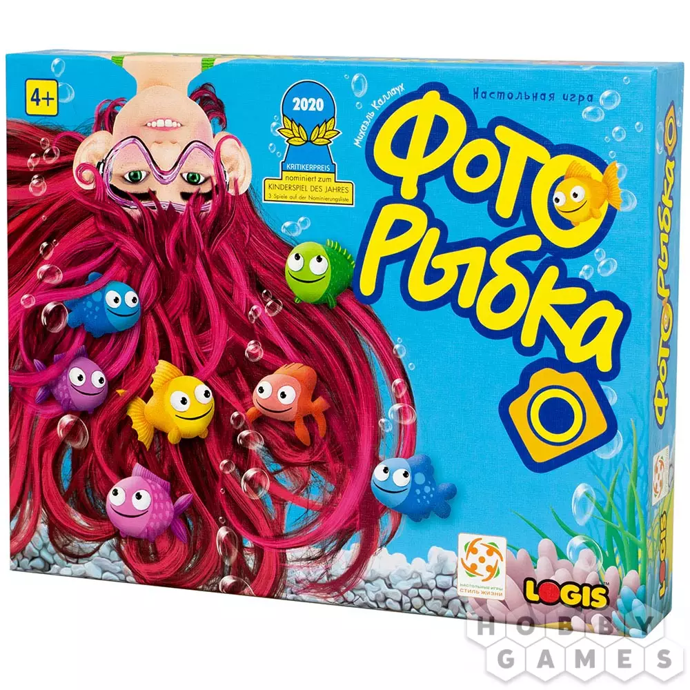 "Фоторыбка" – это детская настольная игра на развитие внимания для 2-4 участников, где игроки сначала пытаются сфотографировать рыбок таких цветов, какие выпали на кубиках, а потом собрать из разноцветных частей самую длинную рыбу. Поучаствовать в подводной фотоохоте смогут маленькие игроки аж с 4 лет – только самых маленьких лучше сажать с зелёной стороны аквариума, она попроще. А более опытным игрокам лучше сесть за синюю сторону.