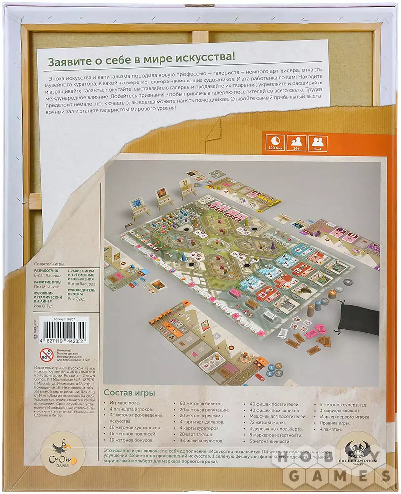 "Галерист" – это стратегическая хардкорная игра Витала Ласерды, где вы становитесь владельцем художественной галереи. Ваша задача – находить перспективных художников, покупать их работы по низкой цене и продавать с максимальной выгодой. Вам предстоит участвовать в аукционах, инвестировать в рекламу талантов, повышать престиж галереи и грамотно управлять помощниками. Каждое решение создаёт цепь последствий: продвижение художника увеличивает стоимость его картин, а удачная выставка привлекает толпы посетителей. Победа достанется тому, кто сумеет найти и удержать баланс между художественным чутьём и деловой хваткой, создав самую влиятельную и прибыльную галерею в мире искусства. Готовы ли вы сыграть в эту изысканную игру, где каждый холст – это лотерейный билет, а каждый клиент – потенциальный меценат?