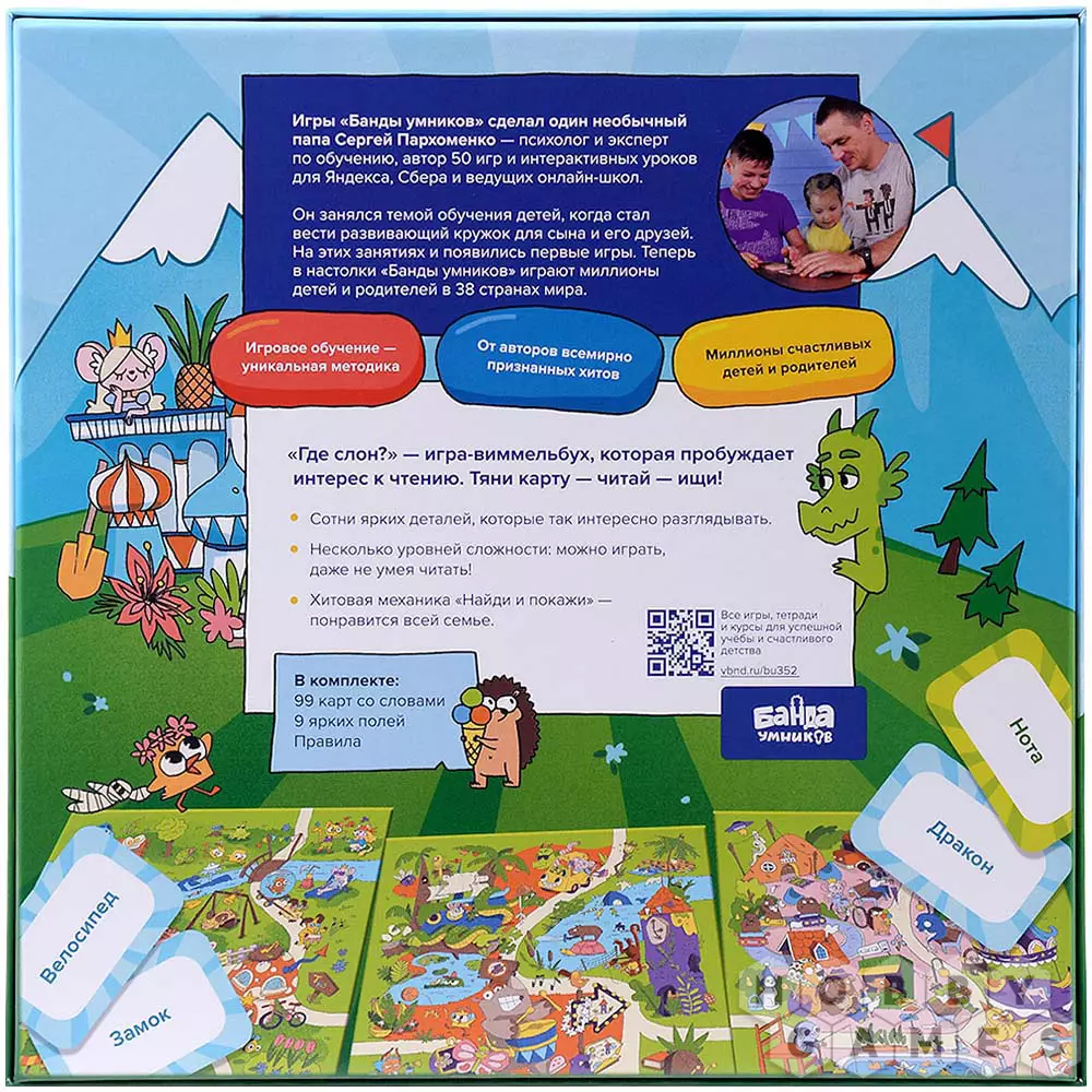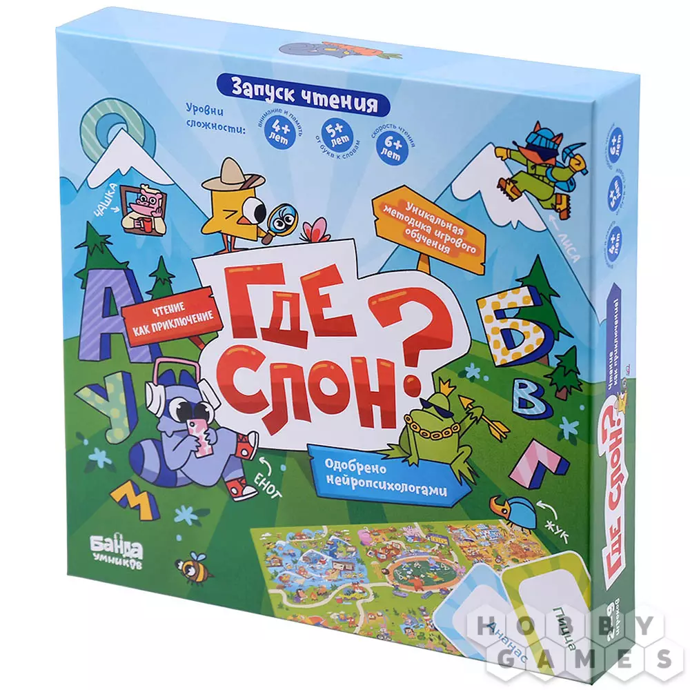 Суть игры в том, чтобы вытянуть карточку и прочитать слово, а потом найти его на разноцветном поле и указать на него пальцем. В раунде побеждает тот, кто нашёл нужный объект первым и забрал себе карточку, а в игре – тот, кто первым собрал 7 карт! Детишки могут играть в неё как самостоятельно, так и со взрослыми – в зависимости от их возраста. В игре существует несколько уровней сложности: короткие слова, длинные, а ещё не слова, а их объяснения – чтобы ребёнок сперва только сообразил, что ему нужно найти, и только потом нашёл. А ещё в "Где слон?" много многозначных слов, что развивает ассоциативные способности и помогает увеличить словарный запас! В общем, отличный вариант для самых маленьких.