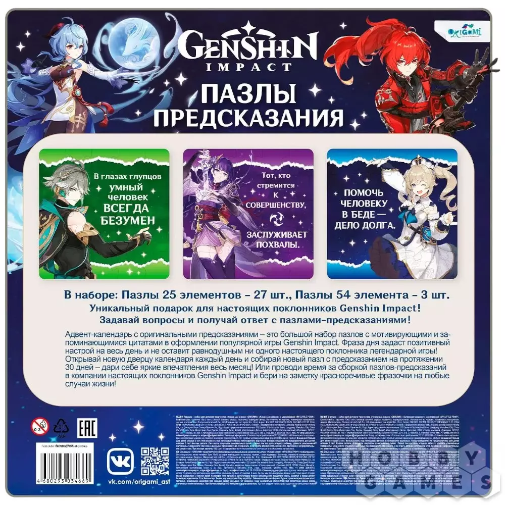 Пазлы от компании "Оригами АСТ" понравится каждому фанату игры Genshin Impact! Небольшое количество деталей данного набора позволит вам быстро собрать картину целиком, а удобный размер фрагментов позволит сделать это с комфортом. Соберите пазл с любимым героем и пусть он украшает пространство вашего дома!