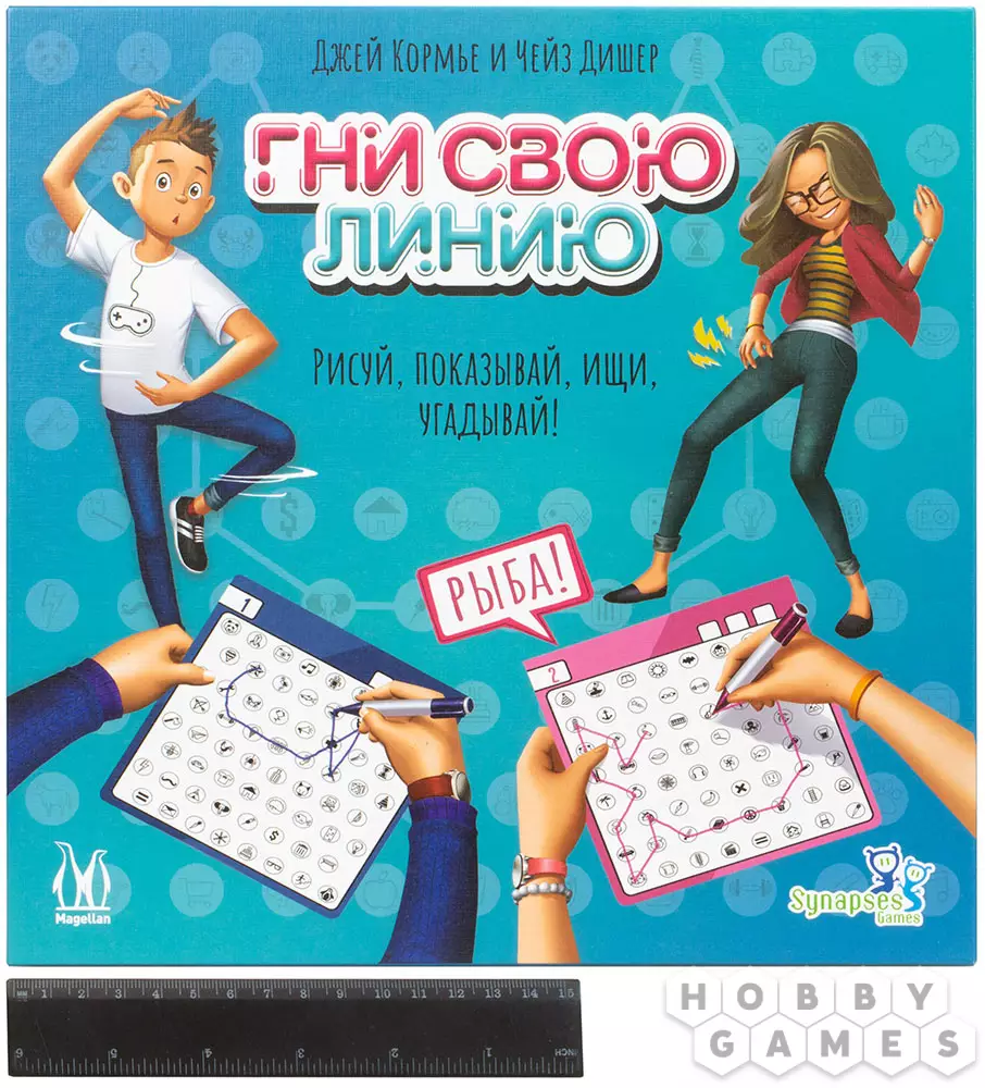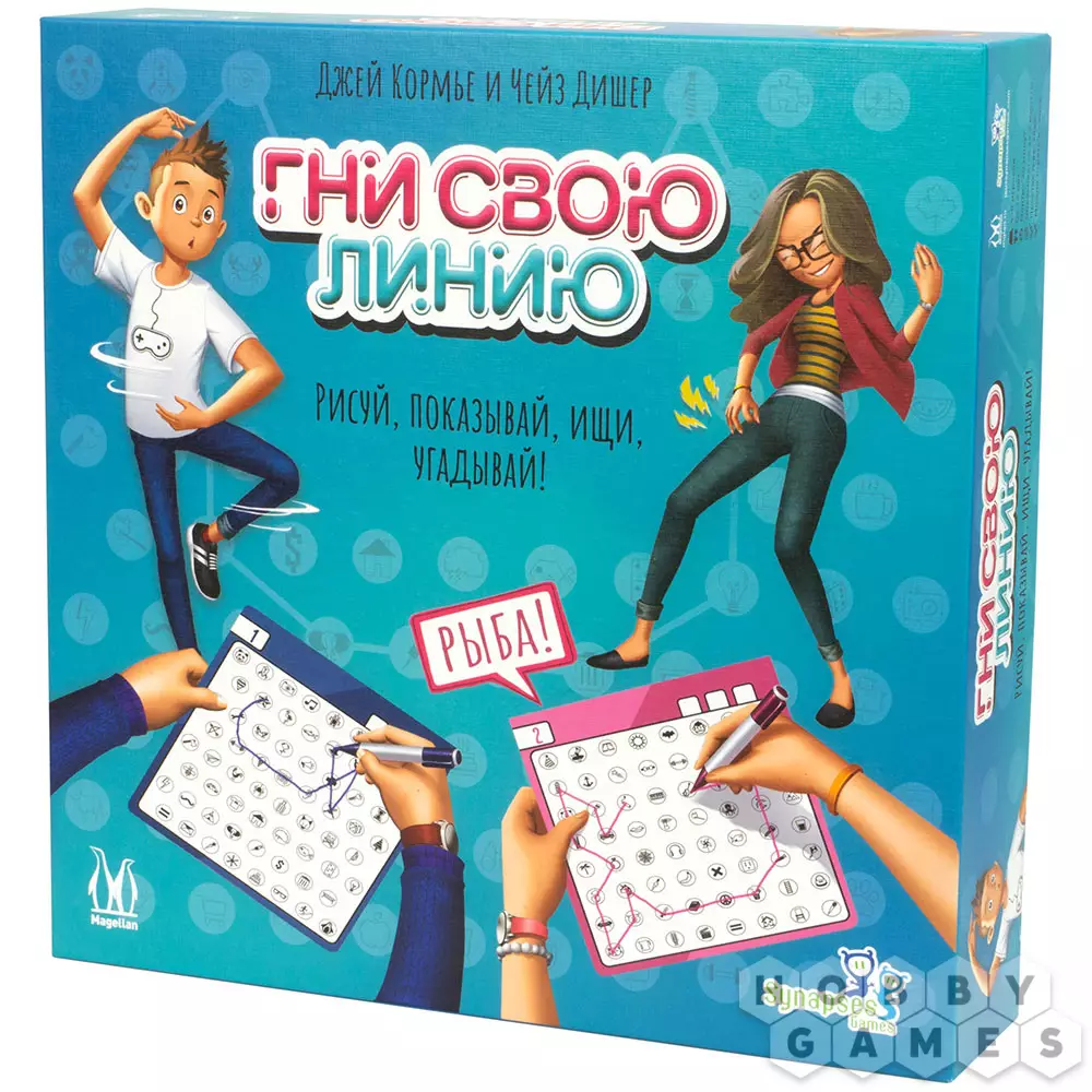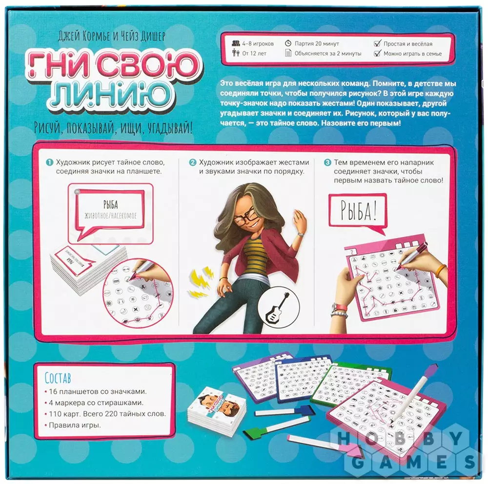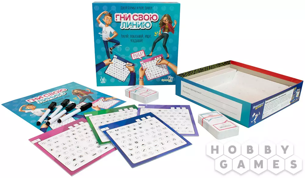 Настольная игра "Гни свою линию" полна веселья и творческого подхода! В ней принимают участие от 2 до 4 команд по 2 человека. Один из членов команды – художник – вытягивает карту и рисует на своём планшете тайное слово, соединяя по порядку разные значки. После этого звуками и жестами он объясняет своему напарнику, какие значки тот должен соединить на своём планшете, чтобы получился такой же рисунок. Та команда, игрок которой первым назовёт загаданное слово, побеждает.