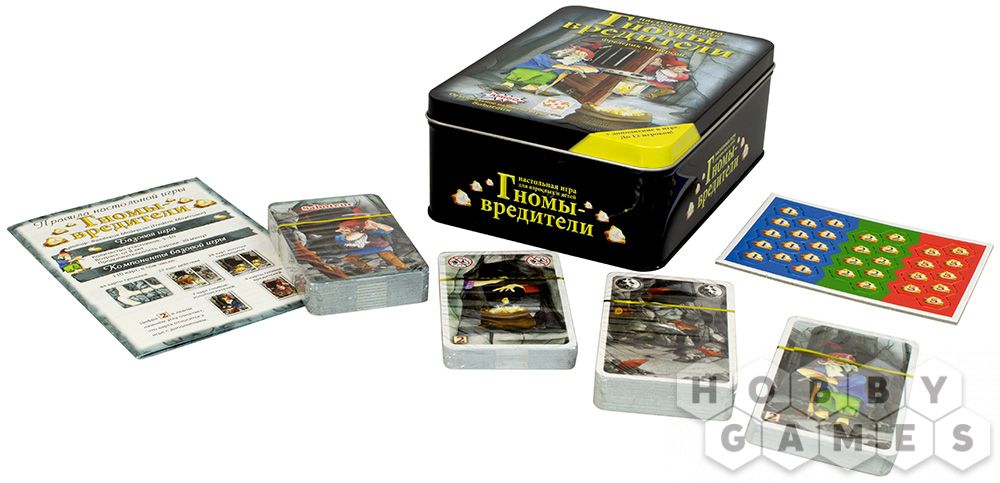 - 15 карт гномов (4 зелёных и 4 синих Золотоискателя, 1 Босс, 2 Геолога, 1 Делец и 3 Вредителя)