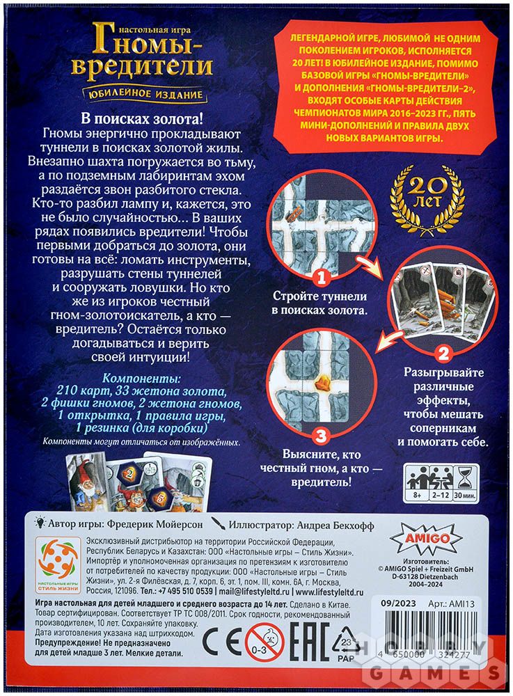 В этом юбилейном издании игры "Гномы-вредители" вас ждёт не только основная версия игры, но и захватывающие дополнения, мини-дополнения и промокарты с Чемпионатов мира последних лет. Это идеальный подарок для всех любителей приключений и стратегических игр!