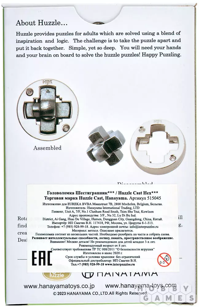 Линейка Huzzle Cast от японской компании Hanayama – это качественные металлические головоломки высокого уровня сложности, которые могут послужить отличным подарком как увлечённому фанату головоломок, так и просто человеку с пытливым умом. Чтобы решить головоломку, вам надо сначала разобрать её, а потом собрать. Причудливые формы и конструкции тщательно продуманы профессиональными создателями головоломок из стран всего мира и опираются на математические расчёты и законы физики.