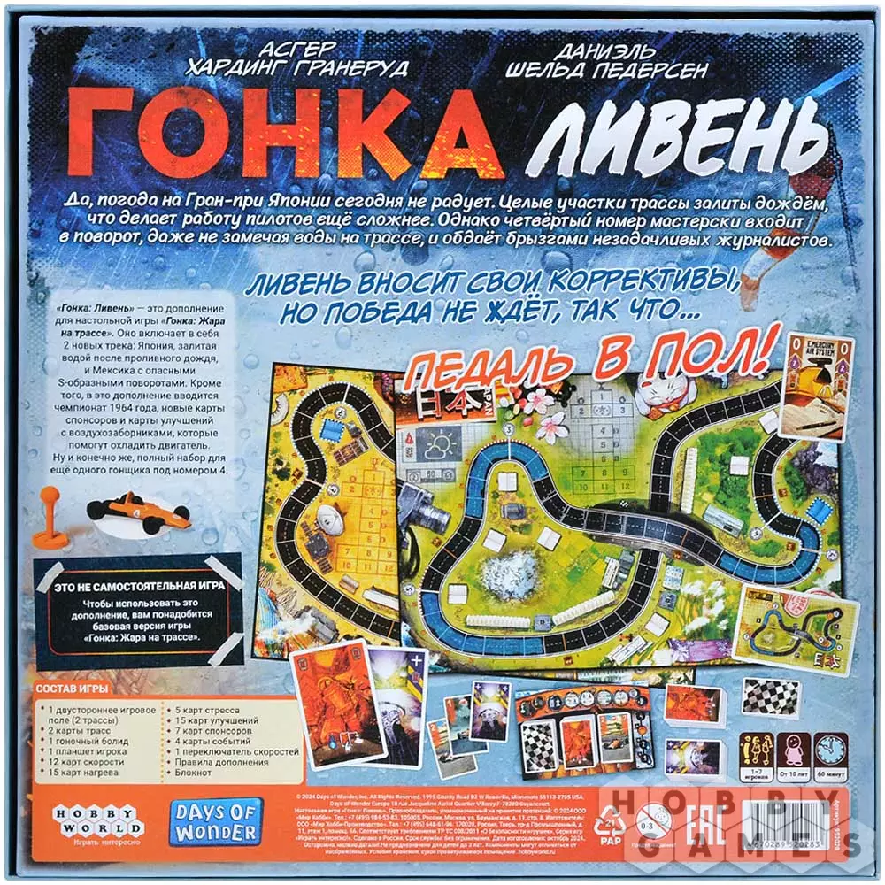"Гонка: Ливень" – это дополнение к игре "Гонка: Жара на трассе", которая предоставит вам целых 2 новых трека. Вы сможете провести заезд в Японии, которая пострадала от мощного дождя, затопившего гоночную трассу, и в Мексике – к ней природа осталась снисходительна, зато проектировщики подготовили маршрут с резкими, опасными змеевидными поворотами. Ну и, конечно, новые треки означают и другие нововведения – например, чемпионат 1964, гонщик под номером 4 и уникальные карты спонсоров и улучшений. Всё, что нужно, чтобы порадовать опытного водителя, который строит гоночную карьеру и стремится войти в историю!