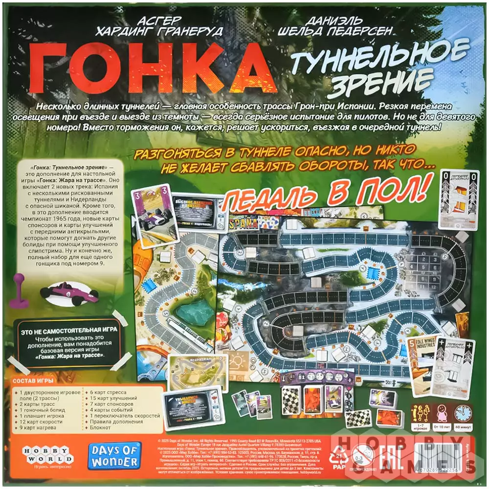 "Гонка: Туннельное зрение" – второе дополнение к игре "Гонка: Жара на трассе", добавляющее две новые трассы, вдохновлённые Гран-при Испании и Нидерландов. Оно вводит свежие механики – туннели и обновлённые условия прохождения поворотов. Появляются карты улучшения переднего крыла, события сезона и возможность играть вплоть до 7 участников (или 8 с дополнением "Ливень"). Дополнение идеально подходит тем, кто хочет повысить сложность и добавить в заезды больше напряжения и стратегической глубины!