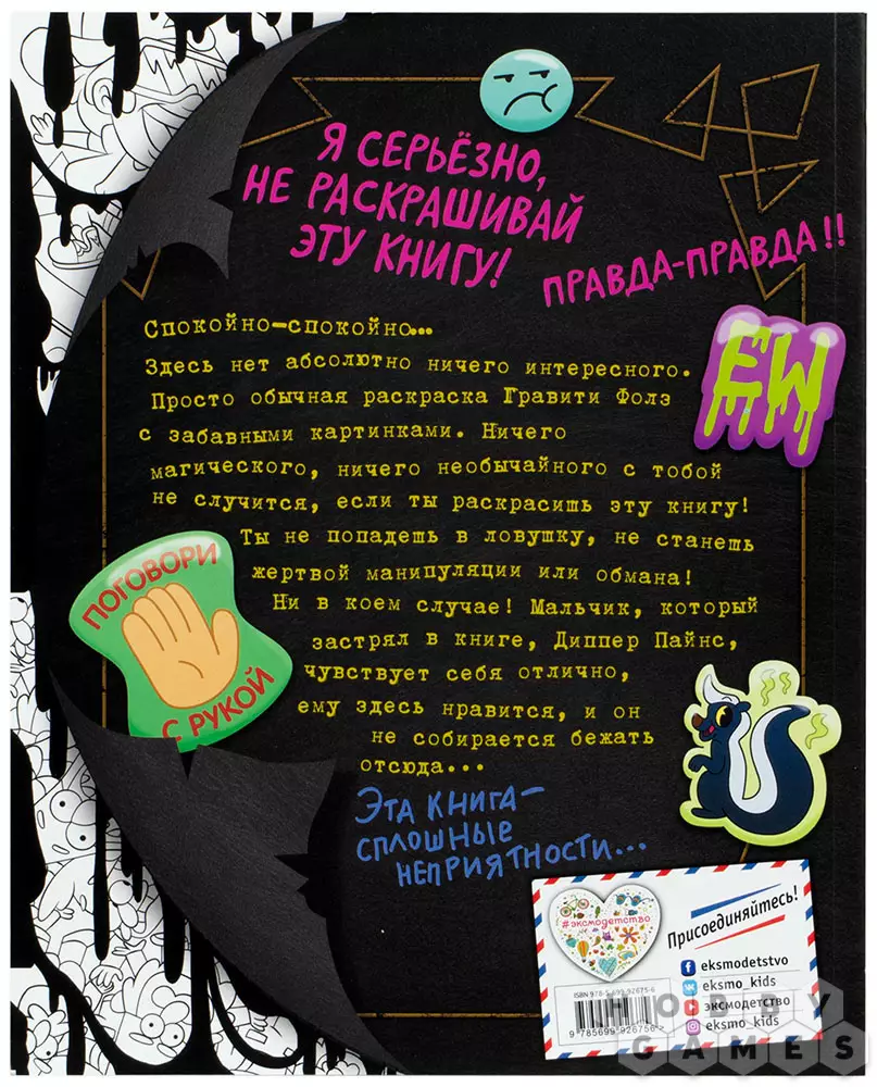 Это – не простая книжка-раскраска, а самая настоящая магическая ловушка, в которую уже кто-то угодил! И этот кто-то – Диппер. Помогите его сестре-двойняшке Мэйбл раскрасить все картинки, чтобы вызволить брата из плена, сама она уже не справляется. Диппер сможет освободиться только тогда, когда каждая страница этой книги будет разукрашена всеми цветами радуги. Вперёд, за работу, но будьте осторожны – не угодите в ловушку сами!